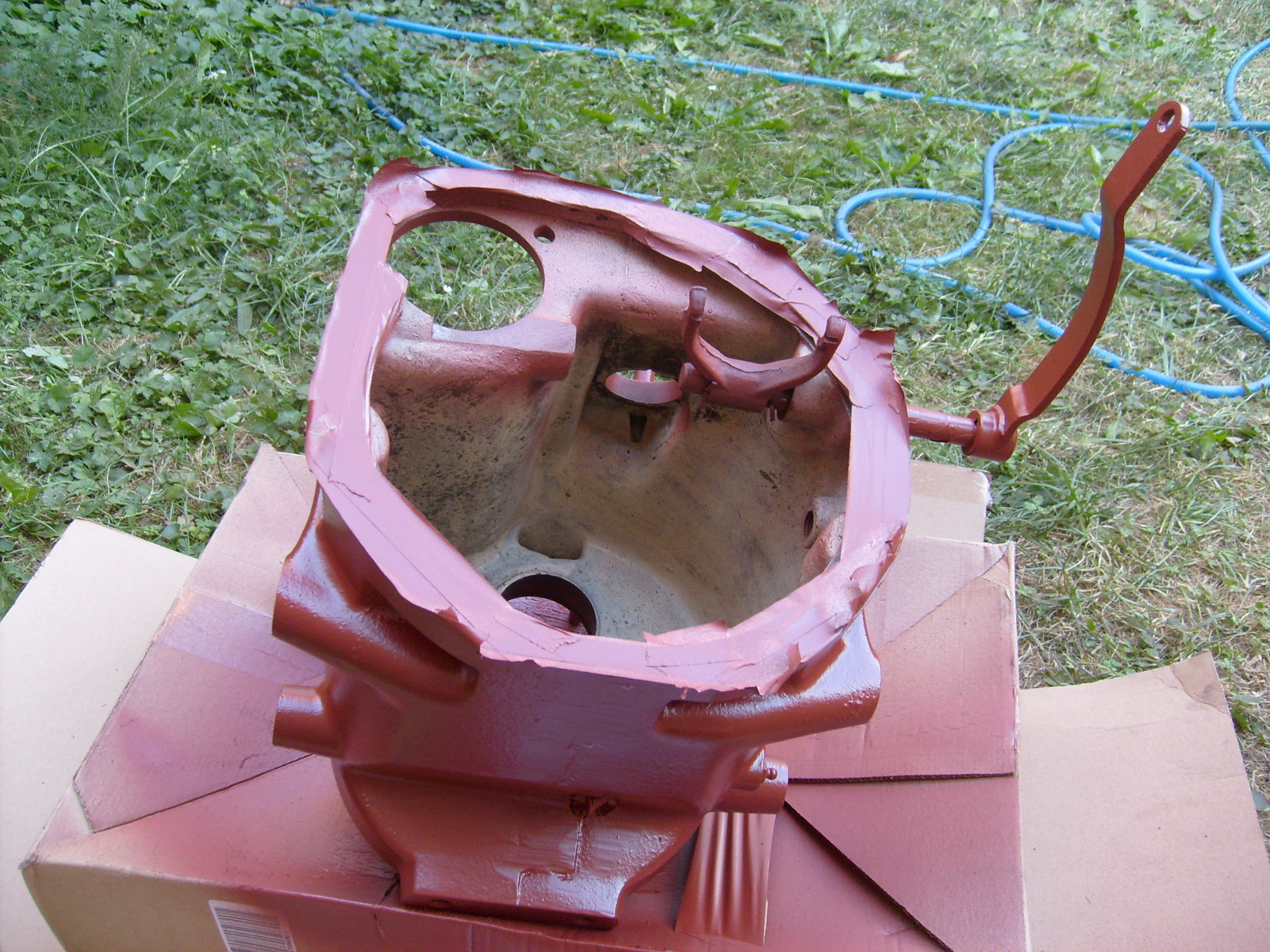 Vor dem grundieren des Kupplungsgehäuses wurden alle alten Lager ausgebaut. Bei einem Lager funktionierte das sehr gut mit Knete. Durch hineinschlagen der Knete mit dem Rundholz wurde das Lager nach aussen gepresst.