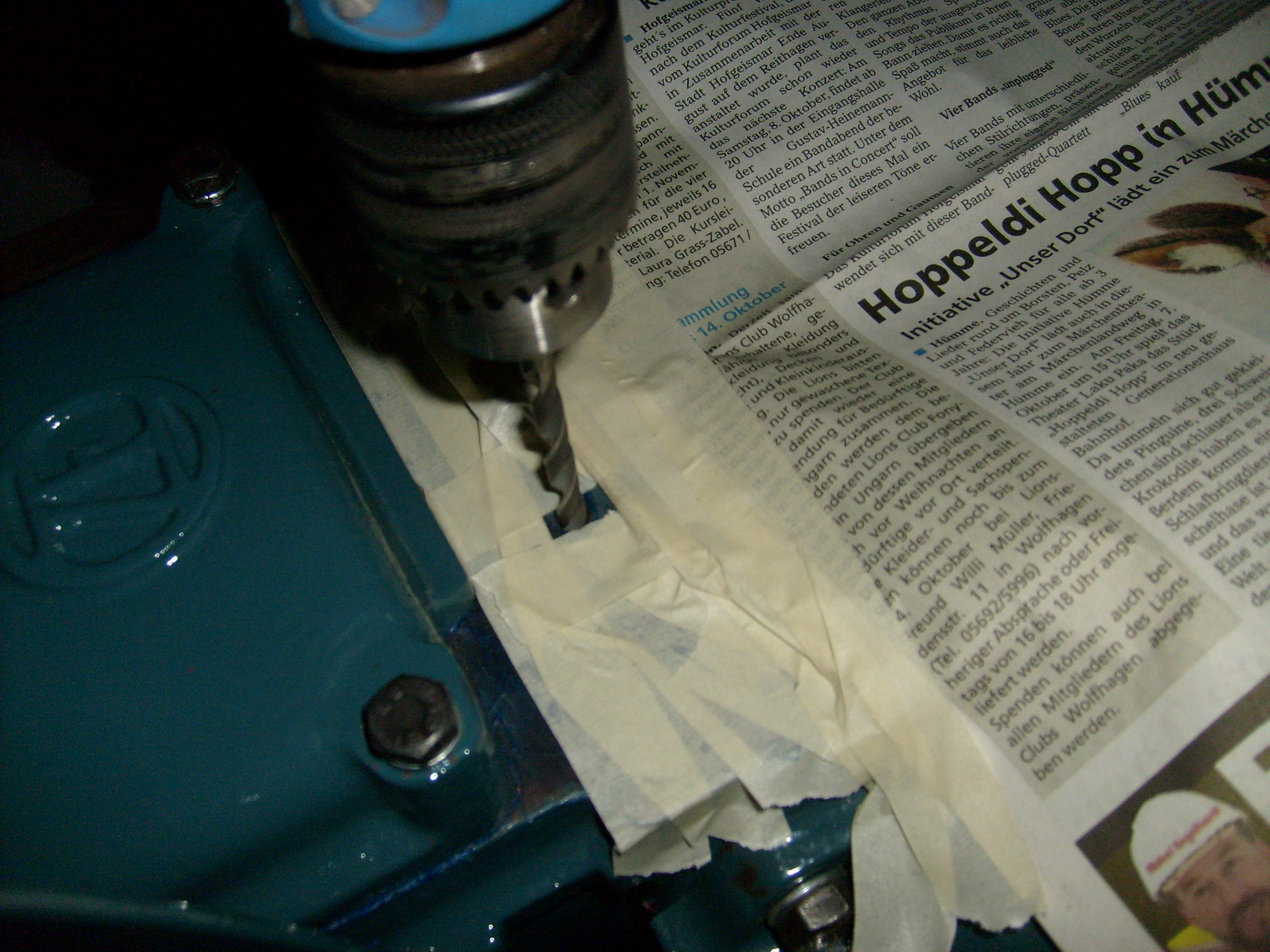 und dann den Flansch in dieser Position mit der Handbohrmaschine und 8 er Bohrer angebohrt. Eigentlich wollte ich das ja genau so anbohren wie es im original Lenkrohr ist, aber die haben da im Werk scheinbar nicht darauf geachtet wie die Speichen stehen bei Geradeausfahrt. Die drei Speichen standen alle auf "kein Bier vor halb vier" irgendwas, aber nichts genaues. Das geht besser. Zurück zu Restaurationsberichte