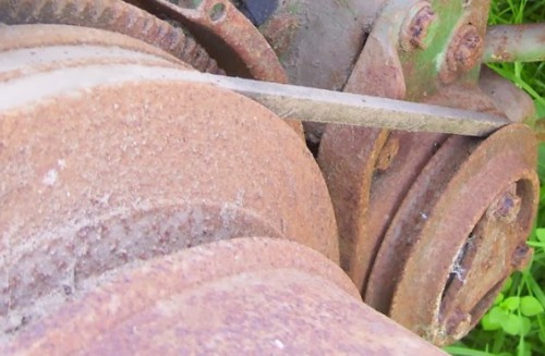 Mit den beiden Riemenscheibenhälften hat der Vorbesitzer möglicherweise einen zusätzlichen Antrieb an den Pumpenantrieb angeflanscht.
