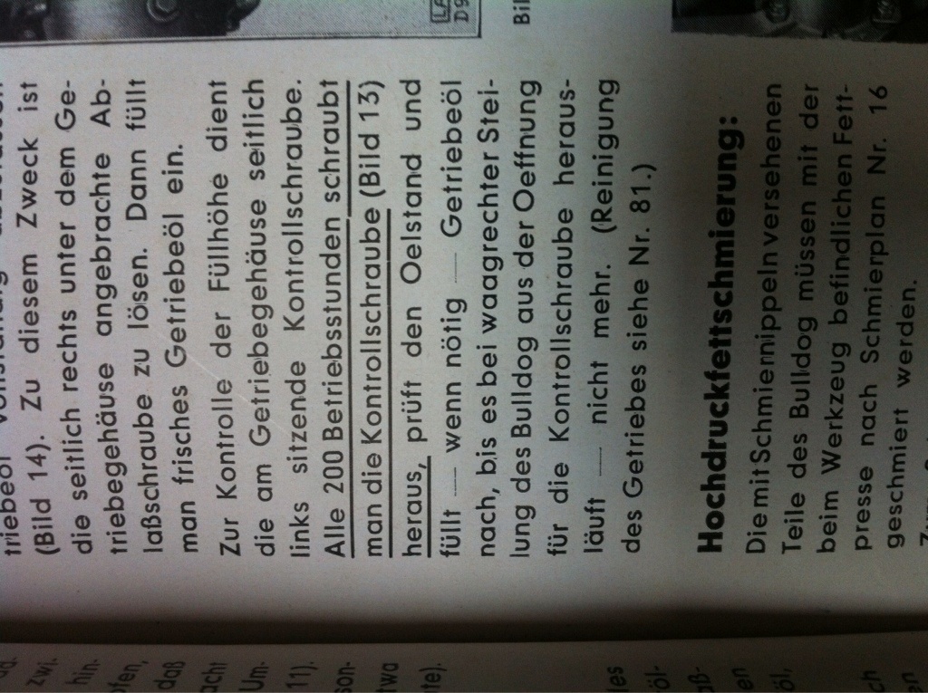 Die richtige Vorgehensweise ist, links hinterm Achstrichter die Kontrollschraube zu öffnen und bei waagerecht stehenden Bulldog so viel aufzufüllen, bis es dort rausläuft.
