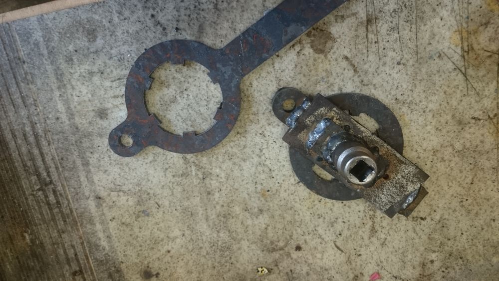 Auch ein schnell zusammengeklippertundgelasertes Tool erbrachte keine Lösung, daraufhin dachte ich, ich versuche das Werkzeug nochmal fix zu einer Art Nuss umzubauen damit ich mit dem Schlagschrauber mehr Erfolg bekomme. Dies schlug natürlich fehl.