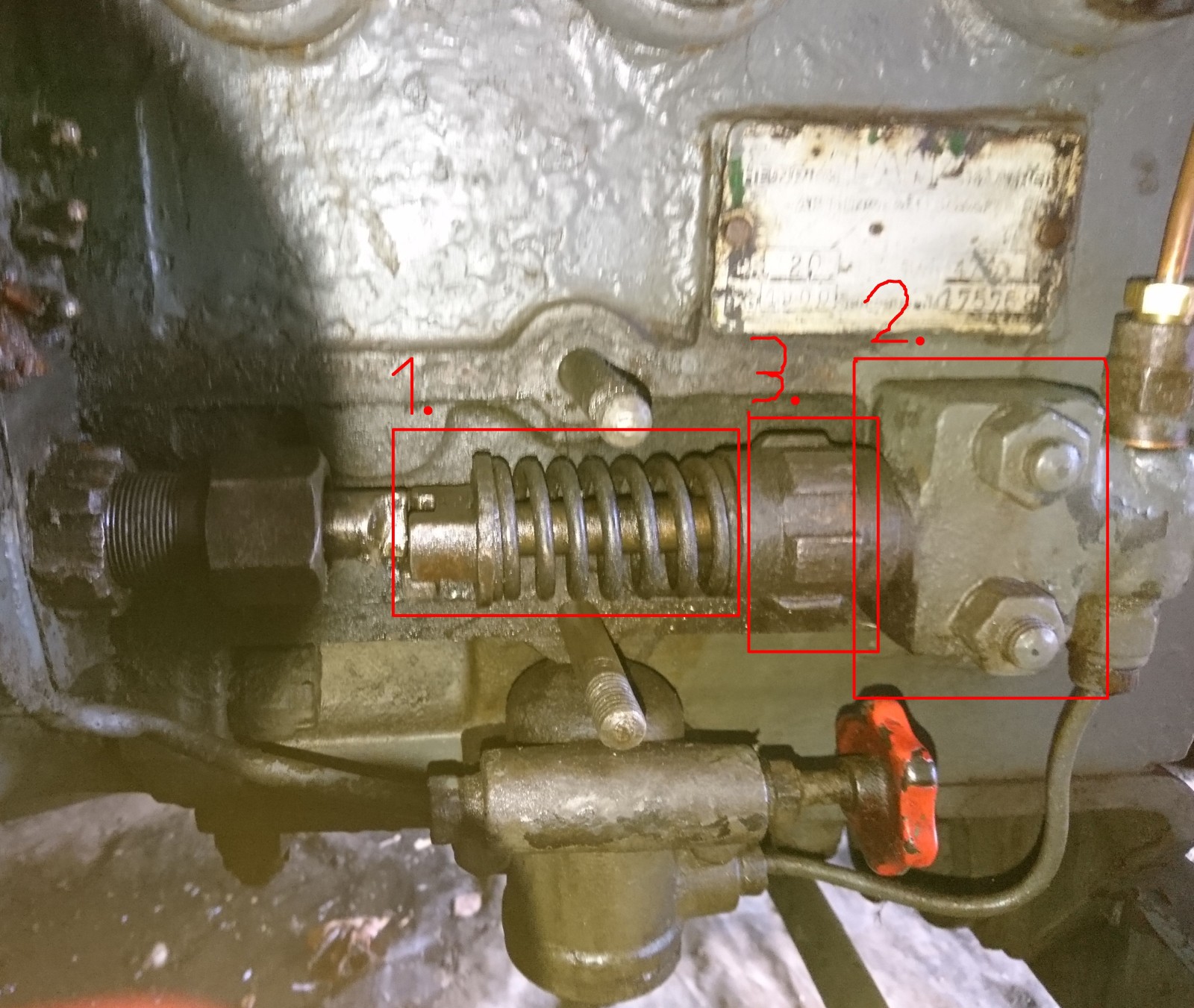 Es gab jedoch ein Problem mit der Feder (siehe Anhang: "1.") der manuellen Dieselpumpe (ich weiß nicht genau wie das Teil korrekt heißt). Wenn ich den Hebel betätige, wird der Bolzen nach rechts geschoben (die Feder zusammengedrückt) aber wenn ich den Hebel loslasse, wird der Bolzen durch die Feder nicht wieder nach links gedrückt. Wenn ich ein wenig an dem Bolzen wackle, springt er sofort & ruckartig zurück. Die Feder hat also noch genug Spannung. Es fühlt sich so an als würde der Bolzen irgendwie verkannten/verklemmen.