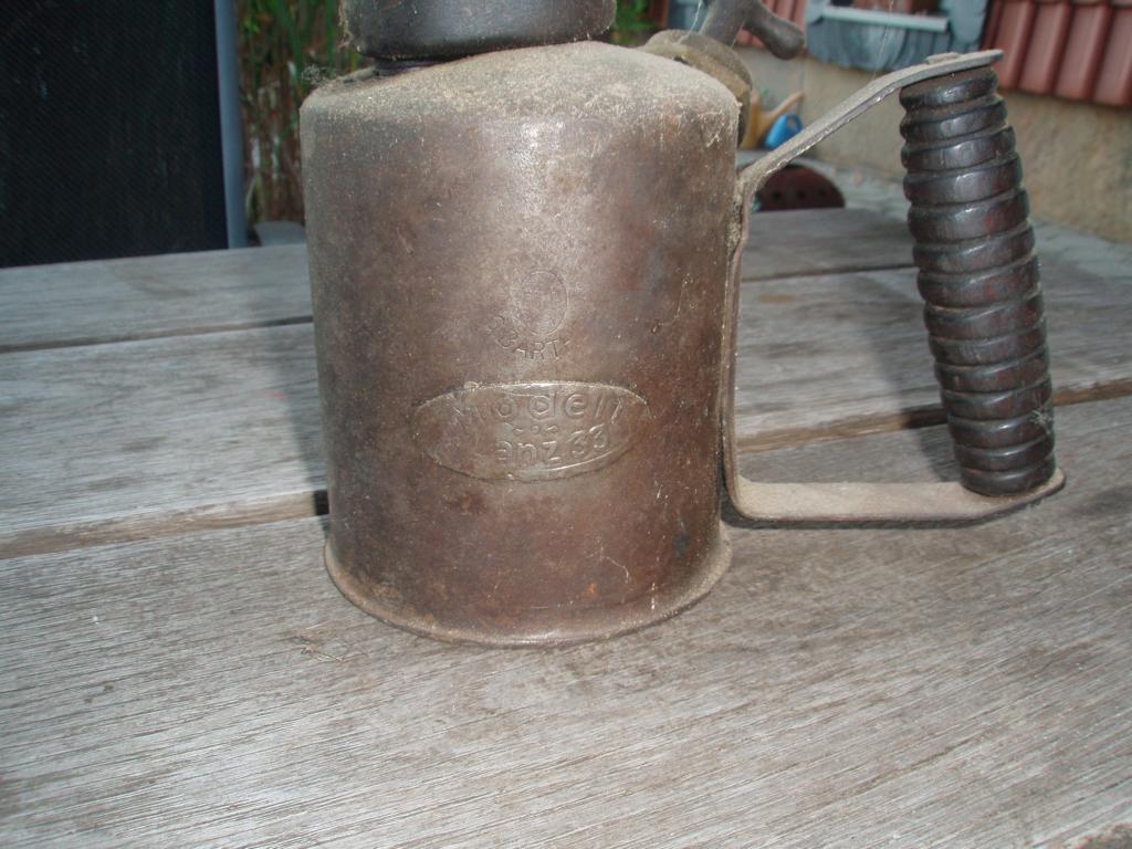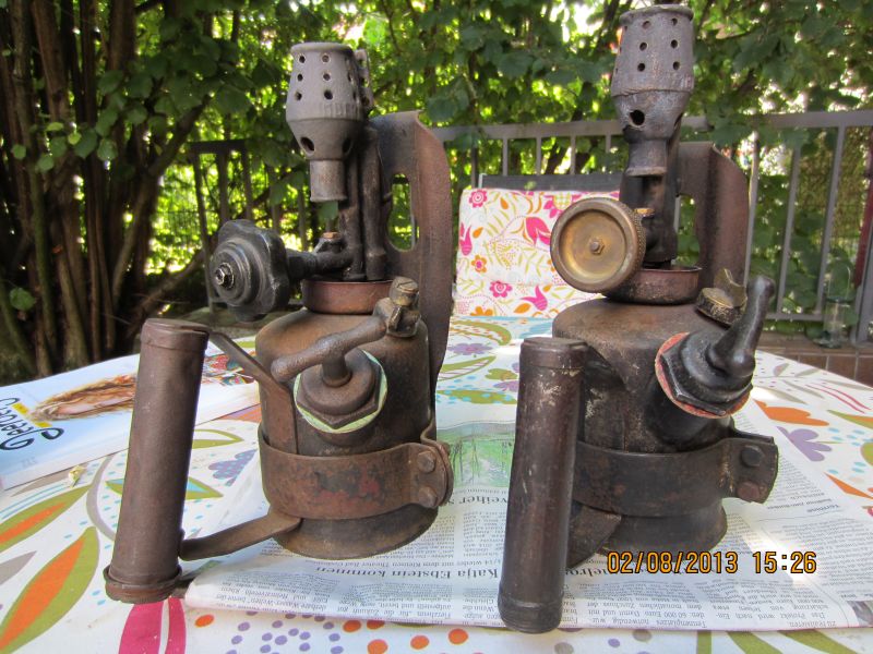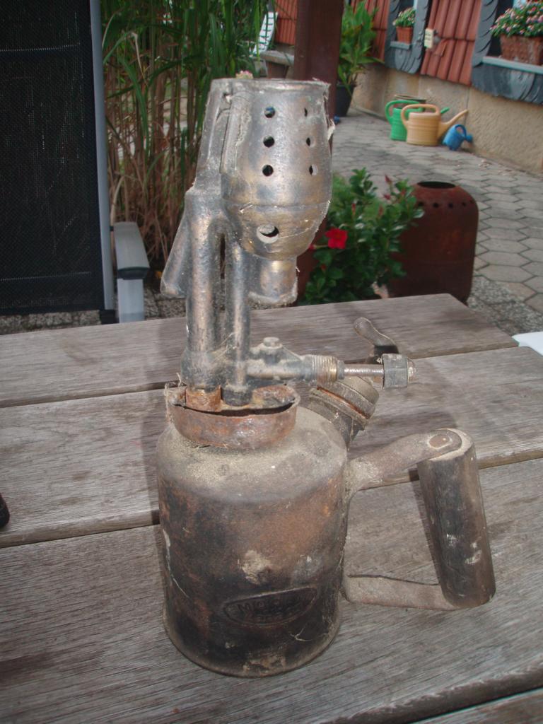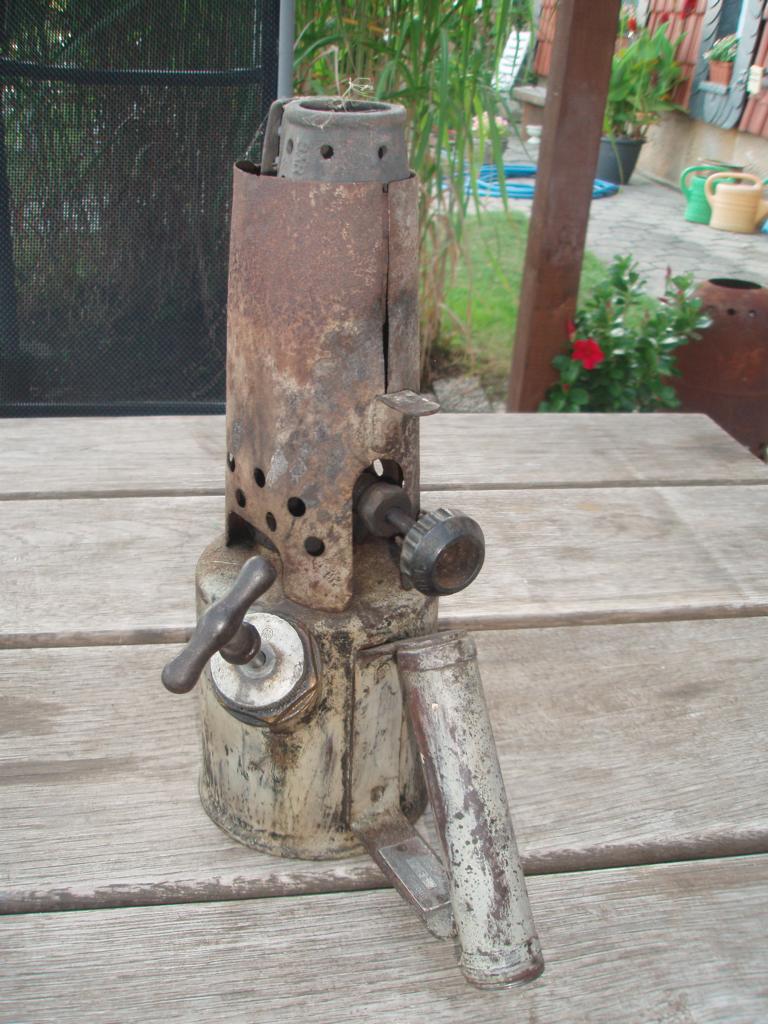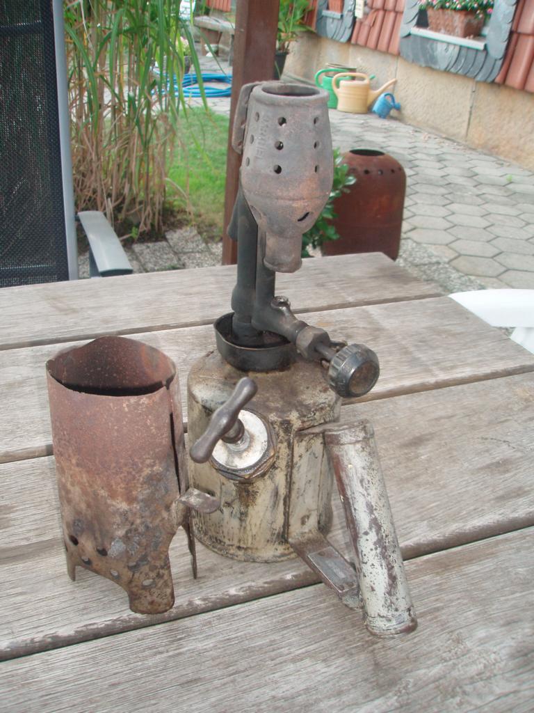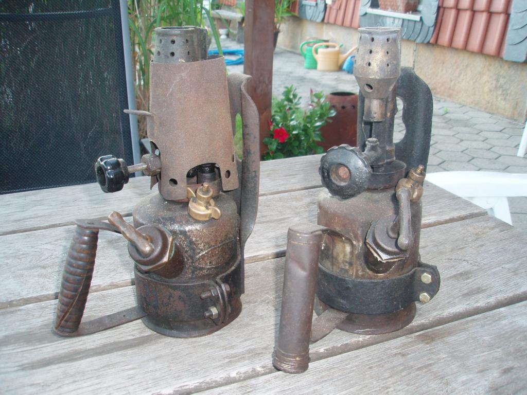 links eine komplett Barthel, rechts Brennerkopf Imbert, Behälter Barthel