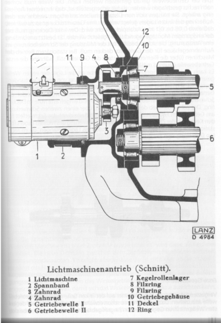 Das gleiche gilt auch für die 2.Getriebewelle (bei deinem Getriebe ist die 2. Welle auch mit Kegelrollenlagern gelagert - nicht wie auf dem Bild mit Zylinderrollenlagern - welches vom großen Glühkopfgetriebe stammt)
