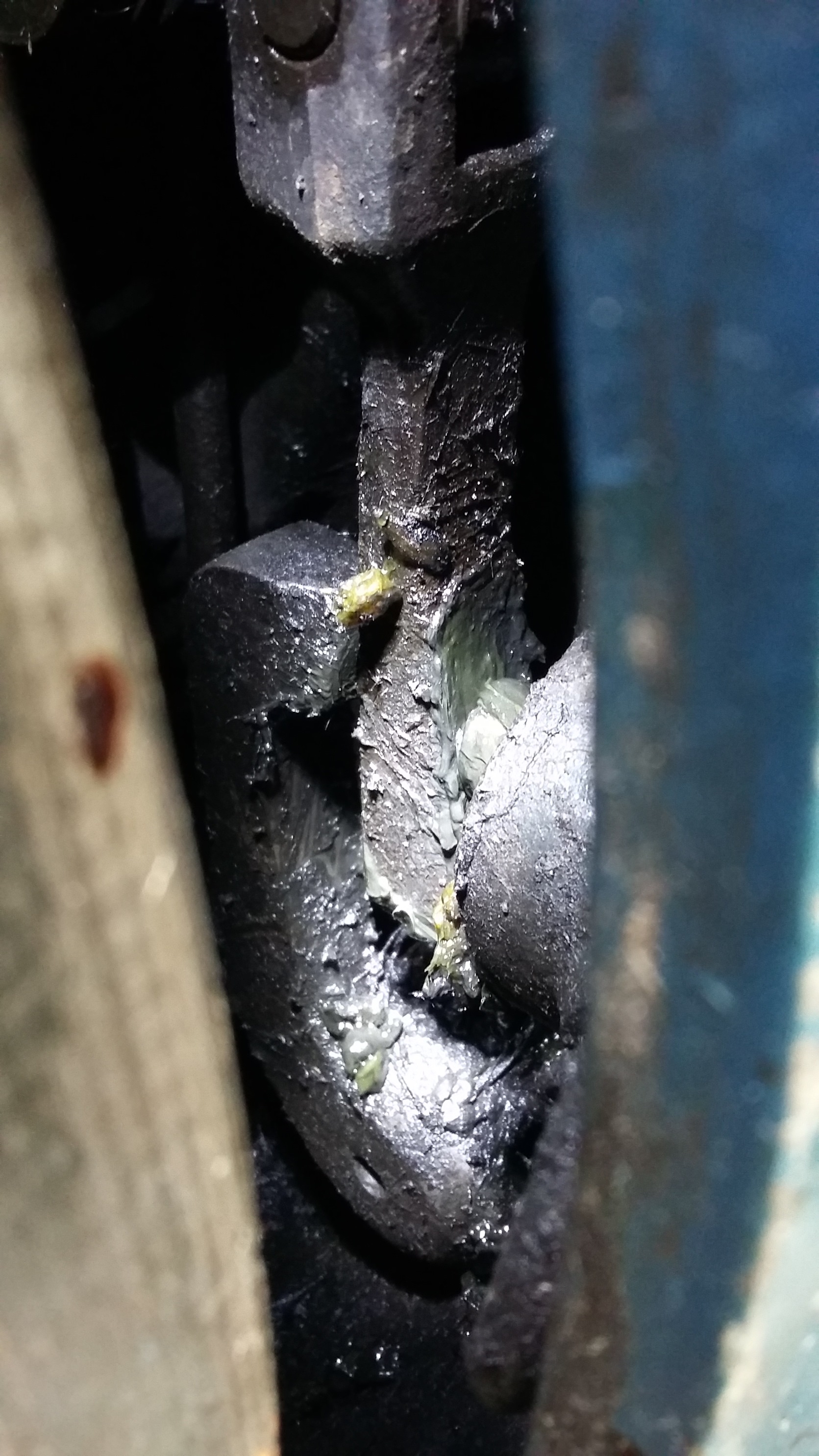 Haut der Hammer zuverlässig auf den Sprittkeil ? Sieht auf dem Bild etwas merkwürdig aus. Die flache bzw. gerade Seite des Keiles soll zum Stößel hin zeigen bzw. dort anliegen...möglicherweise verdreht eingebaut.