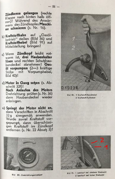 Kraftstoff aufgedreht, Handgashebel auf 3/4,Regulierdüse eine Umdrehung herausgeschraubt, zwei mal vorgepumpt, Lenkrad her und mit Schmackes losgelegt...