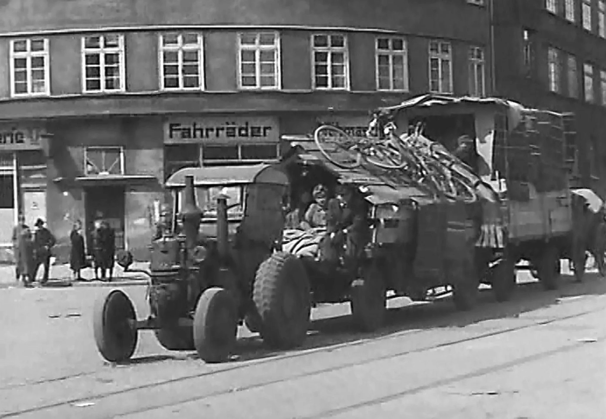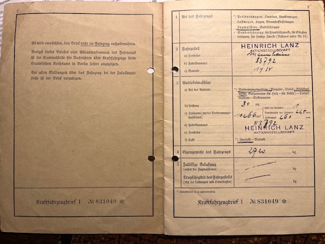 Ich habe eine Frage zur Familiengeschichte. Meine Großeltern hatten einen Gutshof in Mecklenburg. Der erste Traktor dort war ein Stock-Raupenschlepper, den ich mal anhand eines Fotos identifiziert hatte. 1934 wurde ein Bulldog mit Stahlbereifung angeschafft, von dem ich noch den Fahrzeugbrief habe. Im Wirtschaftsjahr 1936/37 kam ein gummibereifter Bulldog hinzu. Mit diesem ging meine Großmutter 1945 auf die Flucht vor den Russen. Nun habe ich zufällig einen von amerikanischen Soldaten am 3.Mai gedrehten Film gefunden, auf dem ein Flüchtlingstreck mit vielen Pferdefuhrwerken und einem Bulldog durch Schwerin fährt. Mich würde interessieren, ob das evtl. der Bulldog meiner Großmutter sein könnte, auch wenn das sich wohl kaum sicher feststellen lässt. Zeit und Ort passen jedenfalls, sicher sind aber auch noch andere mit einem Bulldog auf der Flucht gewesen. Ich habe auch nur wenige Angaben zu dem Traktor: Anschaffungspreis 7563,44 RM in 1936/37, 30 PS, Nr. 129434. Aus dem Film habe ich einen Screenshot gemacht. Vielleicht weiß ja jemand, ob es ganz sicher ein anderes Modell ist oder dass es zumindest sein könnte dass sie dort durchs Bild tuckert.