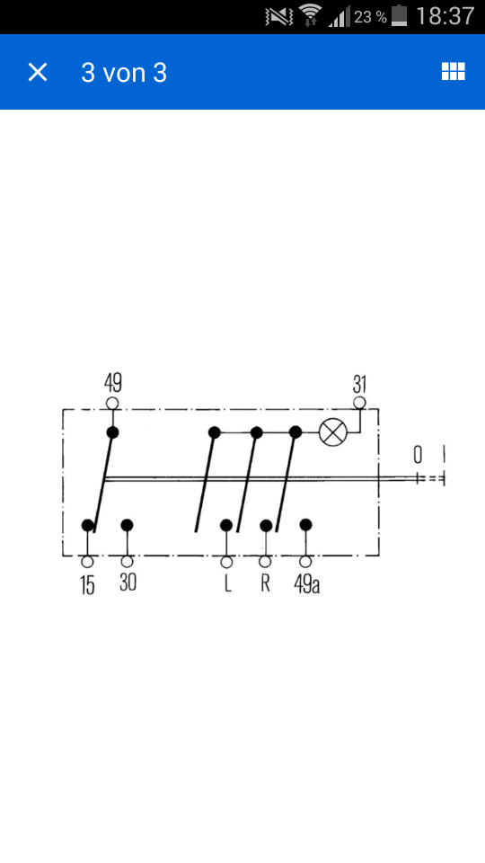 Dabei verbindet er 49 mit 30 und versorgt so auch bei abgezogenem Zündschlüssel den Blinkgeber mit Spannung. Gleichzeitig verbindet er L mit R und mit dem Blinkgeber-Ausgang 49a.