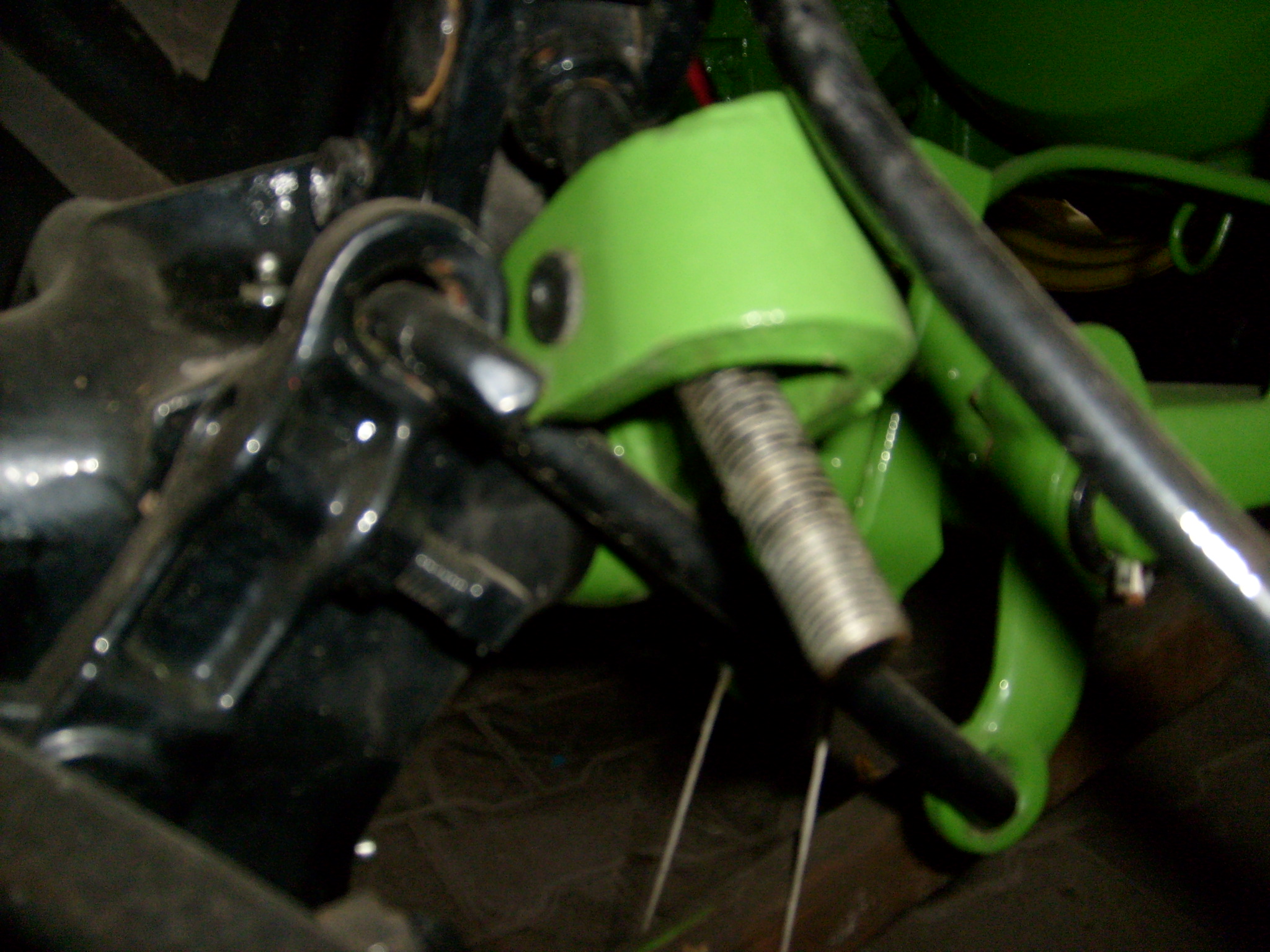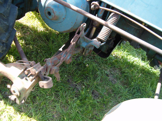 Das Teil mit den drei Bohrungen wird mit der großen Bohrung so auf den Zapfen am Mähwerkrahmen gesteckt, dass die "Nase" zum Hinterrad zeigt. Die "Nase" betätigt beim Anheben des Mähwerkes über einen Hebel mit Gestänge die Messerkupplung. Sie wird also ausgerückt, damit die Holzexenterstange nicht bricht, falls man vergißt das Mähwerk vor dem Anheben abzuschalten. Die Kette wird in den hydraulischen- Aufzughebel-Haken am Bulldog eingehangen. Der S- Haken wird in die noch verbliebene Bohrung eingehangen, die andere Seite des S- Haken wird in die Bohrung des kleinen schwarzen Hebel eingehängt, der bei Dir senkrecht nach oben steht.