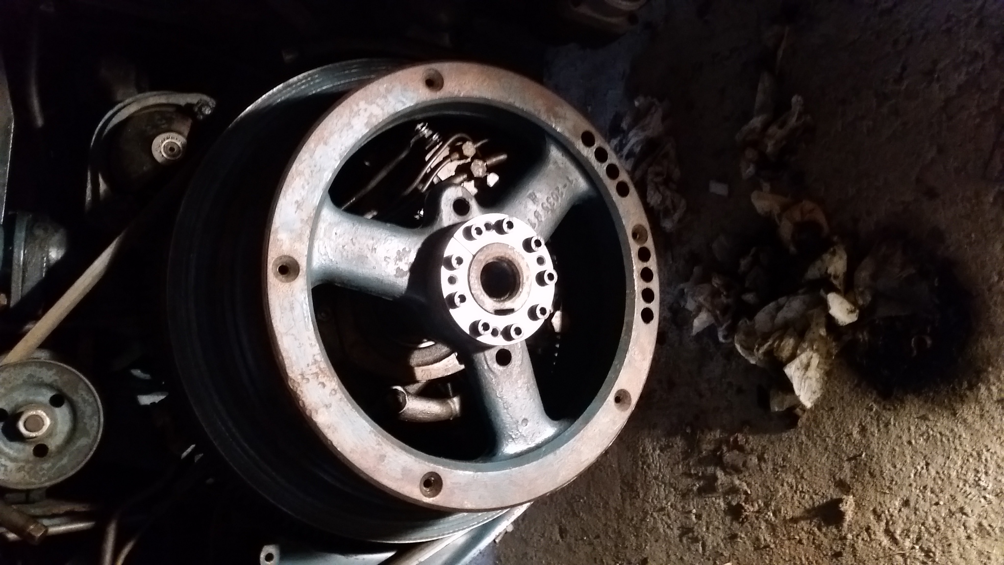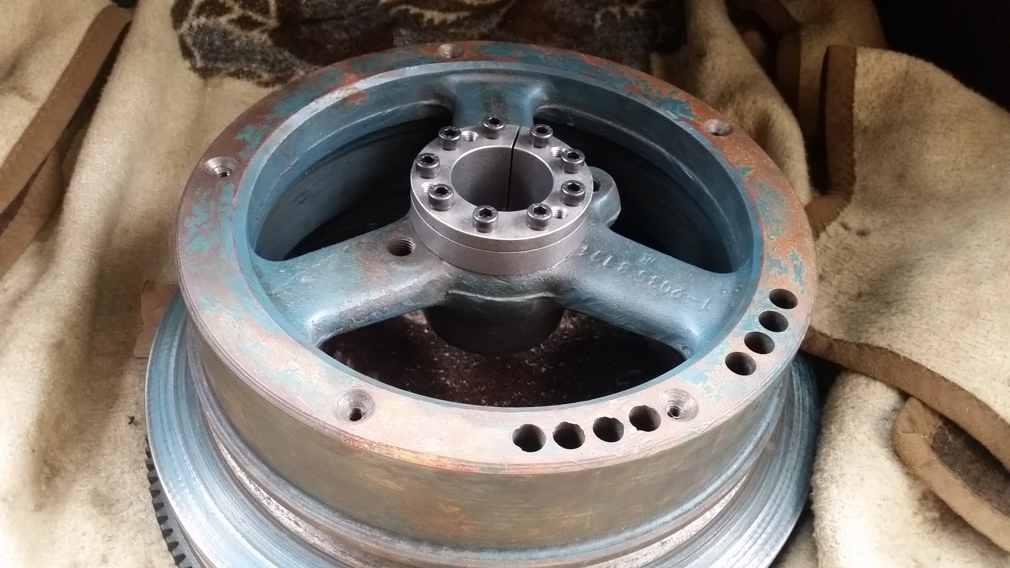 Beim originalen Schwungrad würde ich einen Spannsatz mit dem 74mm Außendurchmesser verwenden (gibts bei Maedler, 35€). Bei größeren Durchmessern wird das Schwungradauge sehr dünnwandig. Das Schwungrad kannst du bei jedem halbwegs ausgestatteten Fräser entweder in Kreisbahn fräsen lassen, oder mit einem Bohrwerkzeug aufspindeln lassen.