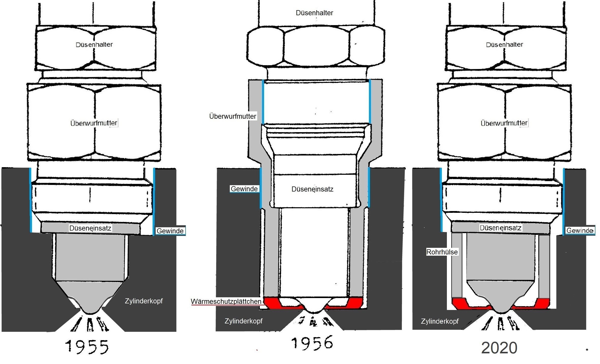 Einspritzdüse vom Lanz-TWN-Dieselmotor, links alte, mittig neue Ausführung, rechts alte Düse in neuem Zylinderkopf.