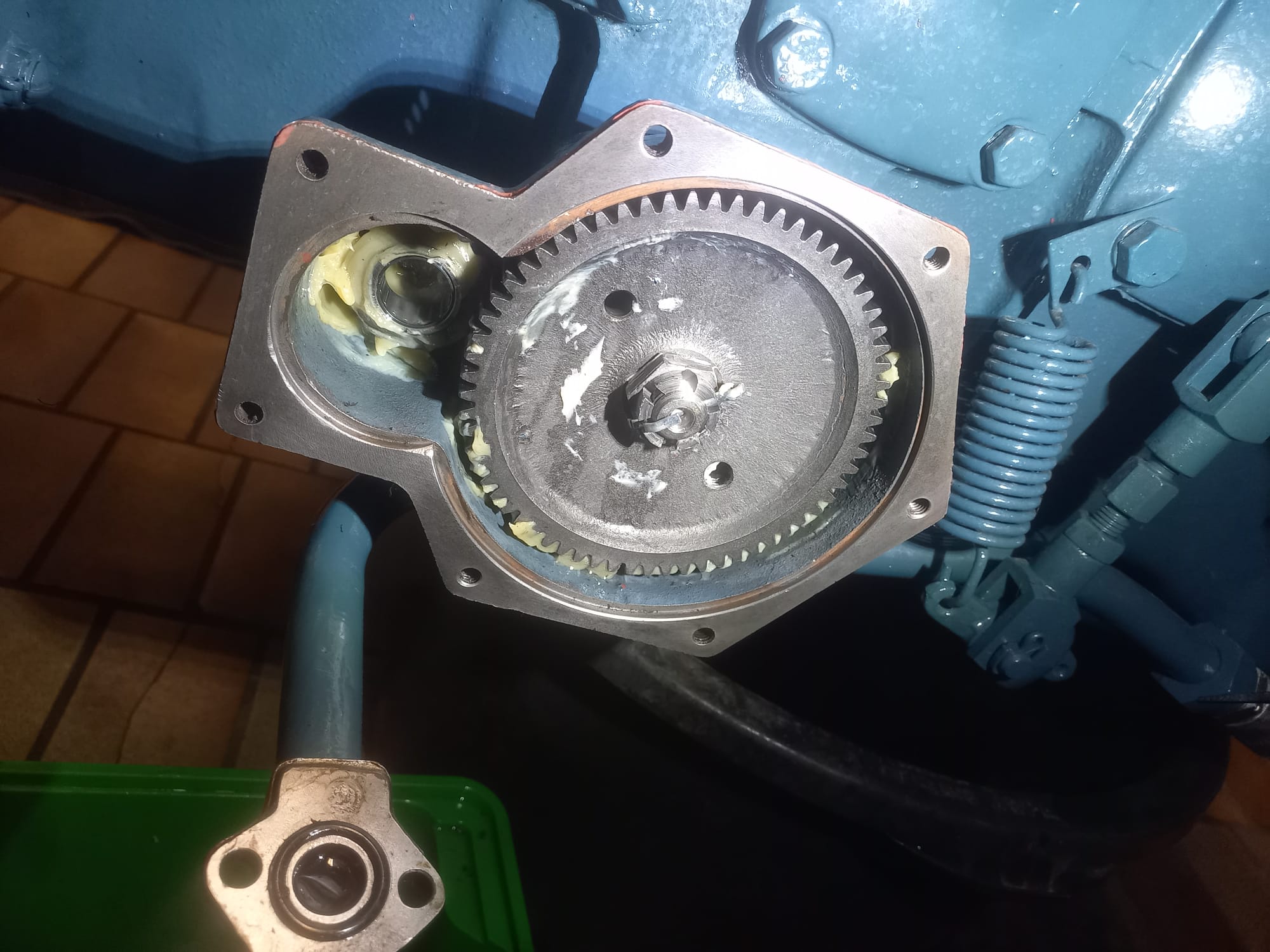 ja, richtig. Aber laut Bild aus meinem Beitrag vom 20.09. ist an einer rechts- oder linksdrehenden Pumpe doch kein Unterschied. ... Außer, dass das Gehäuse genau 180 Grad verdreht aufgesetzt ist, oder??? Der Antrieb bleibt immer an der gleichen Stelle. Links- und rechtsdrehend definiert ja nur, wo Ansaug- und Druckseite sind. Wenn ich vor dem Schwungrad stehe, dreht die Schwungscheibe ja im Uhrzeigersinn - wenn die Pumpe ab ist und der Motor läuft, sieht man, dass der Hydraulikpumpenantrieb im Zwischengehäuse auch im Uhrzeigersinn dreht - übertrage ich diese Drehrichtung jetzt auf meine Pumpe, läuft sie richtig rum: Die Zahnräder der Pumpe greifen ineinander und drehen jeweils den Ölstrom außen an den Zahnrädern vorbei oben zum Druckausgang - gelbe Markierung - und so ist es genau richtig. Wichtig ist, dass die Brille, wo beide Zahnräder drin geführt sind, mit den 2 Ablaufnuten (grün markiert) Richtung Saugseite montiert sind, dass im Falle von Überdruck das Öl dort wegkann. So habe ich es zumindest einmal von einem Hydraulikspezialisten gehört.