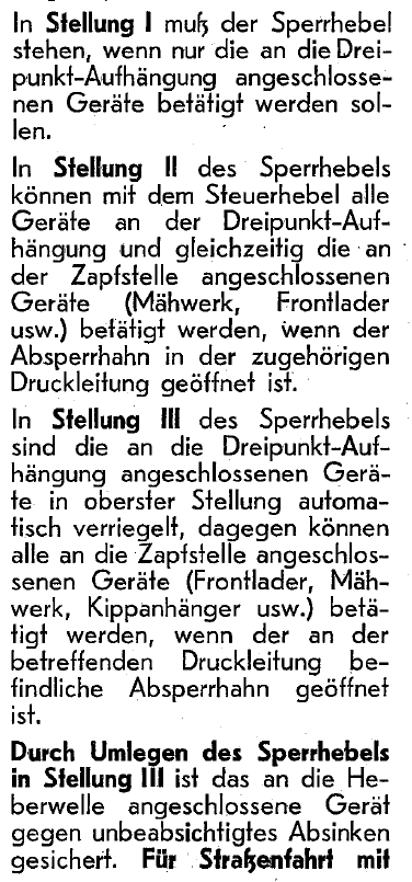 Stellung I wird verwendet, wenn nur die Blockhydraulik verwendet wird. Stellung II für Blockhydraulik und gleichzeitig sämtliche an die Zapfstelle angeschlossene Geräte (Mähwerk, Frontlader...). Stellung III ist für die mechanische Transportsicherung der Blockhydraulik, die Geräte an der Zapfstelle können weiter bedient werden. (siehe Bild Stellungen Sperrhebel)