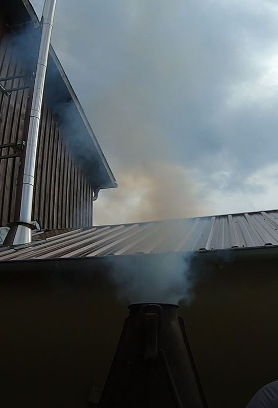 Im Lauf hat sich gezeigt, dass der Bulldog im hohen Drehzahlbereich extrem raucht (siehe Bild, auch während der Fahrt am Berg z.B.). Herr Gutruf hat mir im Vorhinein gesagt, dass bei Volllast eigentlich nur eine leichte weiße Abgaswolke zu sehen sein sollte. Ich habe mir dann das Verhalten der Regelstange bei laufendem Motor angesehen. Die Regelstange bewegt sich mit dem Gasgeben augenscheinlich normal (im Laufen ist der Anschlaghebel weit hinter (in Fahrtrichtung) der Markierung 1,7 was nach meinem Kenntnisstand auch normal ist).