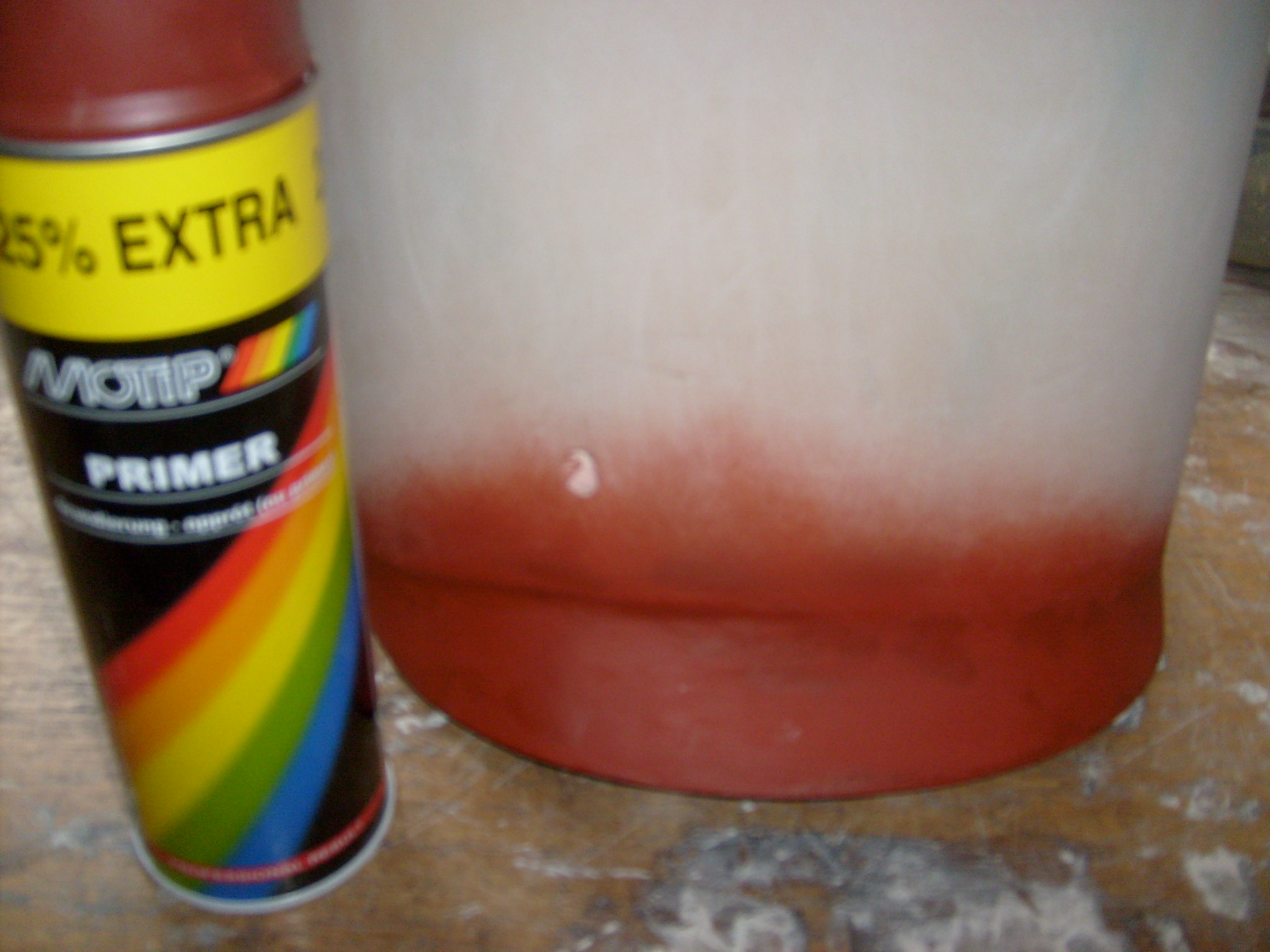 Wir nehmen entweder die rotbraune Rostschutzgrundierung auf Lösemittelbasis, wie man Sie in jedem Baumarkt bekommt, oder die rotbraune aus der Spraydose. Wobei die Farbe wohl keine große Rolle spielt. Nur beim schleifen des Spachtel sieht man dann besser, wenn man wieder fast durchgeschliffen hat. Das Luftfilter hatten wir mit der Lackierpistole vorgrundiert. Auch nach über einer Woche Trocknungszeit bildeten sich beim schleifen des Spachtel Farbknubbel, die aus der noch weichen und nicht schleifbaren Grundierung her rührten. Daher ist es sinnvoller die Grundierung mit der Spraydose auszuführen, wenn darauf gespachtelt werden soll. Ich weis jetzt gar nicht ob das 1 K oder zwei 2 K ist. Ich kaufe da einfach immer die Rostschutzgrundierung rotbraun die neben den anderen Autolack-Farbspraydose im Baumarkt angeboten wird. "s hat noch immer gut gegangen.... Wenn alles fertig gespachtelt ist wird dann ganz normal mit der Lackierpistole und dem Rostschutzgrund aus der Dose, vermischt mit dem richtigen Anteil Universalverdünnung, grundiert.