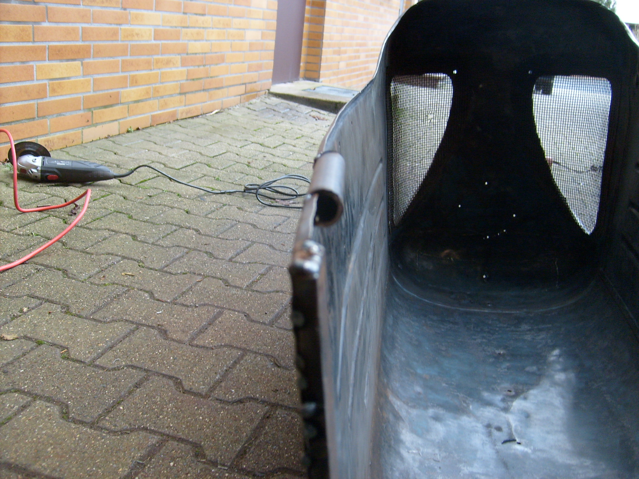 Kommen wir zu der größten Baustelle, jedenfalls was die Abmasse betrifft, der Motorhaube. Alle verschweißten Risse wurden geschliffen. Die zuvor beschriebene Fehlstelle an der Unterkannte haben wir repariert. Dazu wurde eine der Rundung geeignetes Rundrohr eingeschweißt: