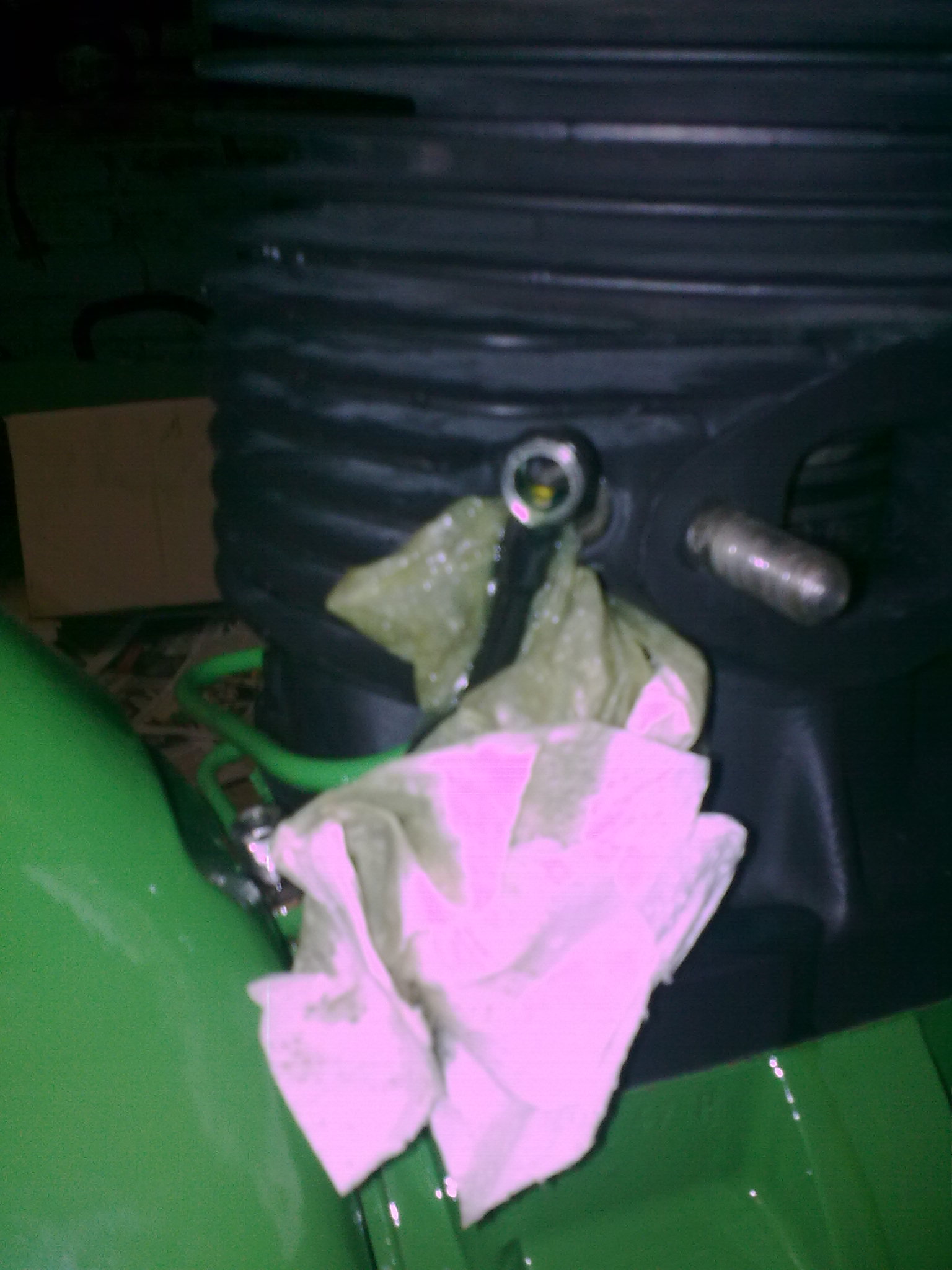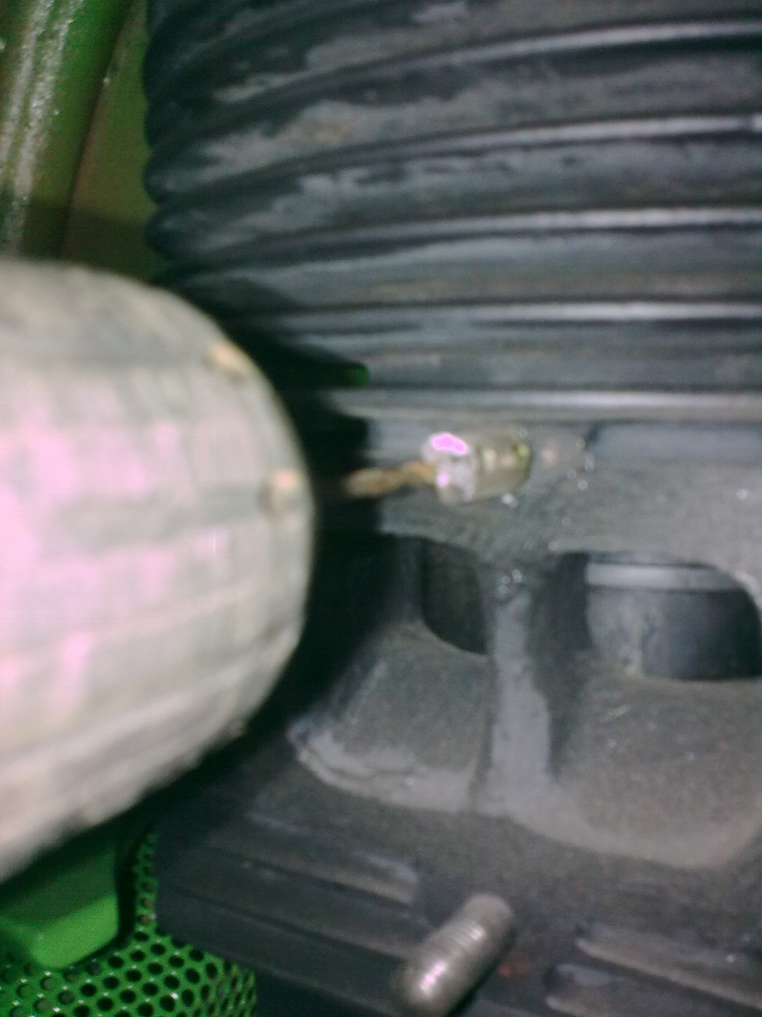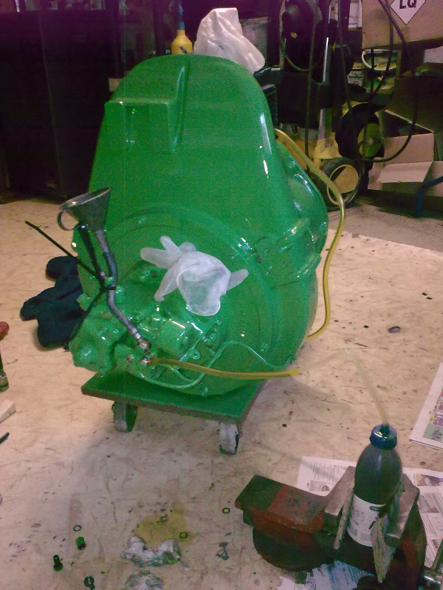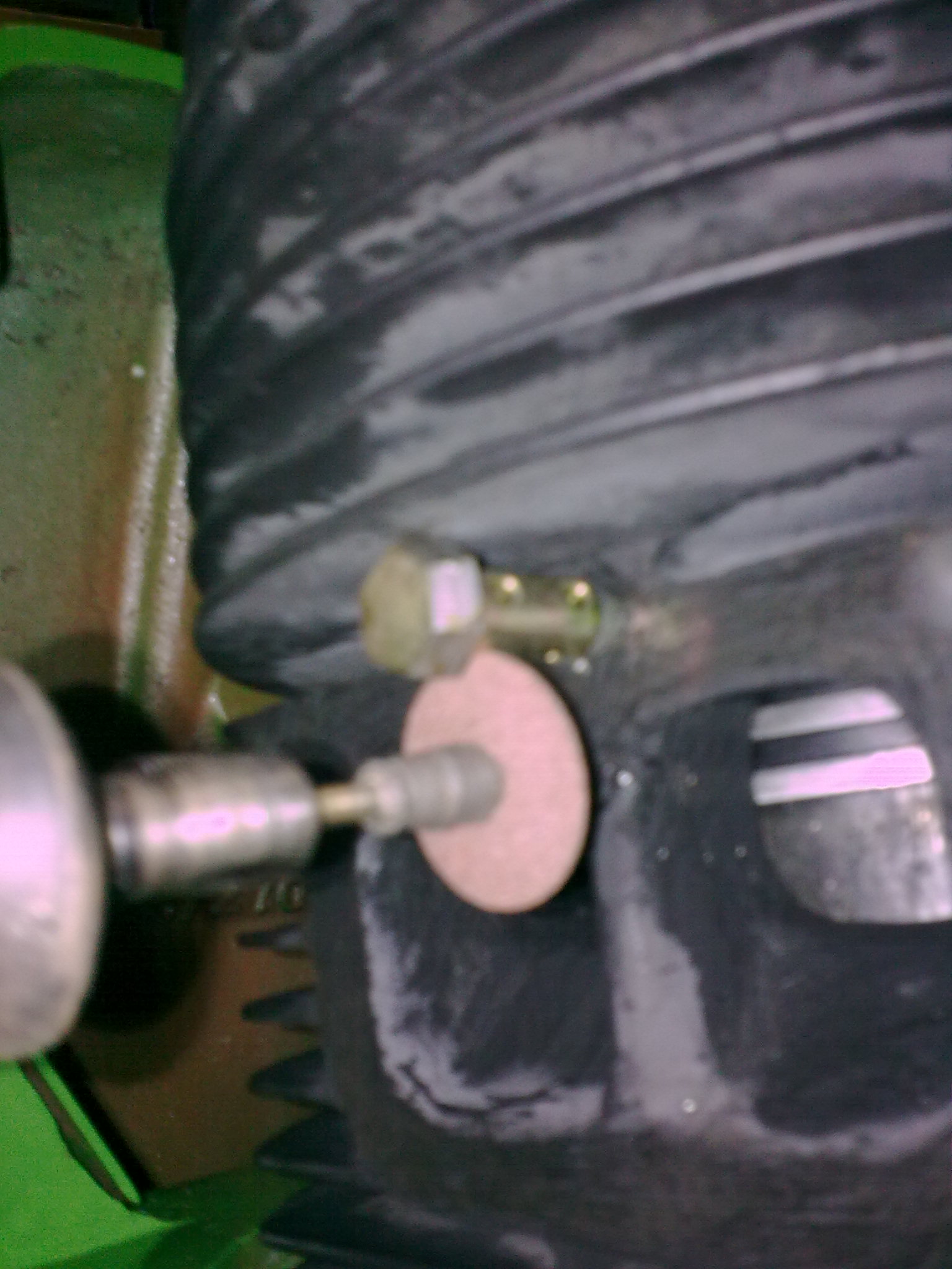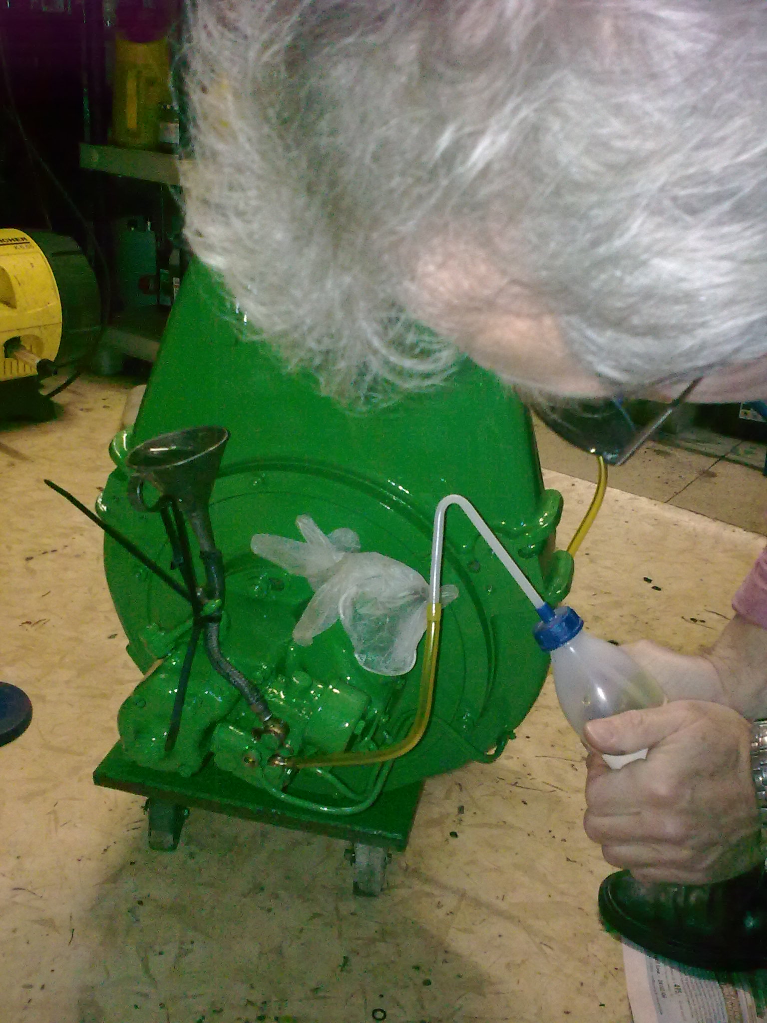 Bevor nun die Luftführungshaube auf dem Zylinder montiert wird ist daran zu denken, erst die beiden Ölleitungen zu entlüften. Lanz sieht das so vor, dass man das Öl von oben in die Leitungen gibt und es an der Pumpe luftfrei austreten soll. Das ist aber zumindest an der Ölleitung zum Kurbelwellenlager sehr umständlich. Es geht auch einfacher. Das erste was ich schon beim Bulli gemacht habe ist, die Ölleitungsverschraubung zum hinteren Kurbelwellenlager zu "tunen". Diese ist ab Werk sehr schlecht erreichbar. Der Trick ist einfach. Es wird oben drauf eine M6 er Mutter geschweißt, die dann ganz einfach von oben mit einer Stecknuss oder einem Steckschlüssel bedient werden kann. Nachdem neue Kupferringe untergelegt sind und die Hohlschraube nur einige Gewindegänge eingeschraubt ist, geht das Entlüften los. Dazu entfernt man vorne an der Pumpe beide Hohlschrauben der beiden Leitungen. Zum Entlüften der Lagerleitung nimmt man jetzt die längere der beiden Hohlschrauben und steckt diese durch eine Ringöse einer selbstgebaute Öldruckleitung und auch durch die Ringöse der Ölleitung zum Lager. Natürlich werden jeweils Dichtringe zwischengelegt. Am anderen Ende steckt man den Schlauch der selbstgebauten Öldruckleitung auf eine Pumpflasche/Spritzflasche. Nun füllt man diese Flasche mit halbwegs dünnem Motoröl, z.B. SAE30. Beim Zusammenpressen entweicht zunächst die Luft aus Flasche und Öldruckleitung und aus der Hohlschraube, die noch nicht an der Ölpumpe festgezogen ist. Nun dreht man die Hohlschraube an der Ölpumpe fest. Vorsicht! Die Leitungen stehen unter Spannung, den Schlüssel erst ansetzen, wenn die Hohlschraube definitiv gepackt hat! Bevor es jetzt an das Entlüften der eigentlichen Ölleitung des Motors geht, wird die Ölleitung vom Öltank zur Ölpumpe an der Ölpumpe angeschlossen und mittels Trichter mit Motoröl gefüllt. Das hat den Zweck, dass sich später die Ölleitungen hierüber nicht wieder Luft "holen" können. Das Drücken der Flasche ist sehr anstrengend, habe ich mir sagen lassen...