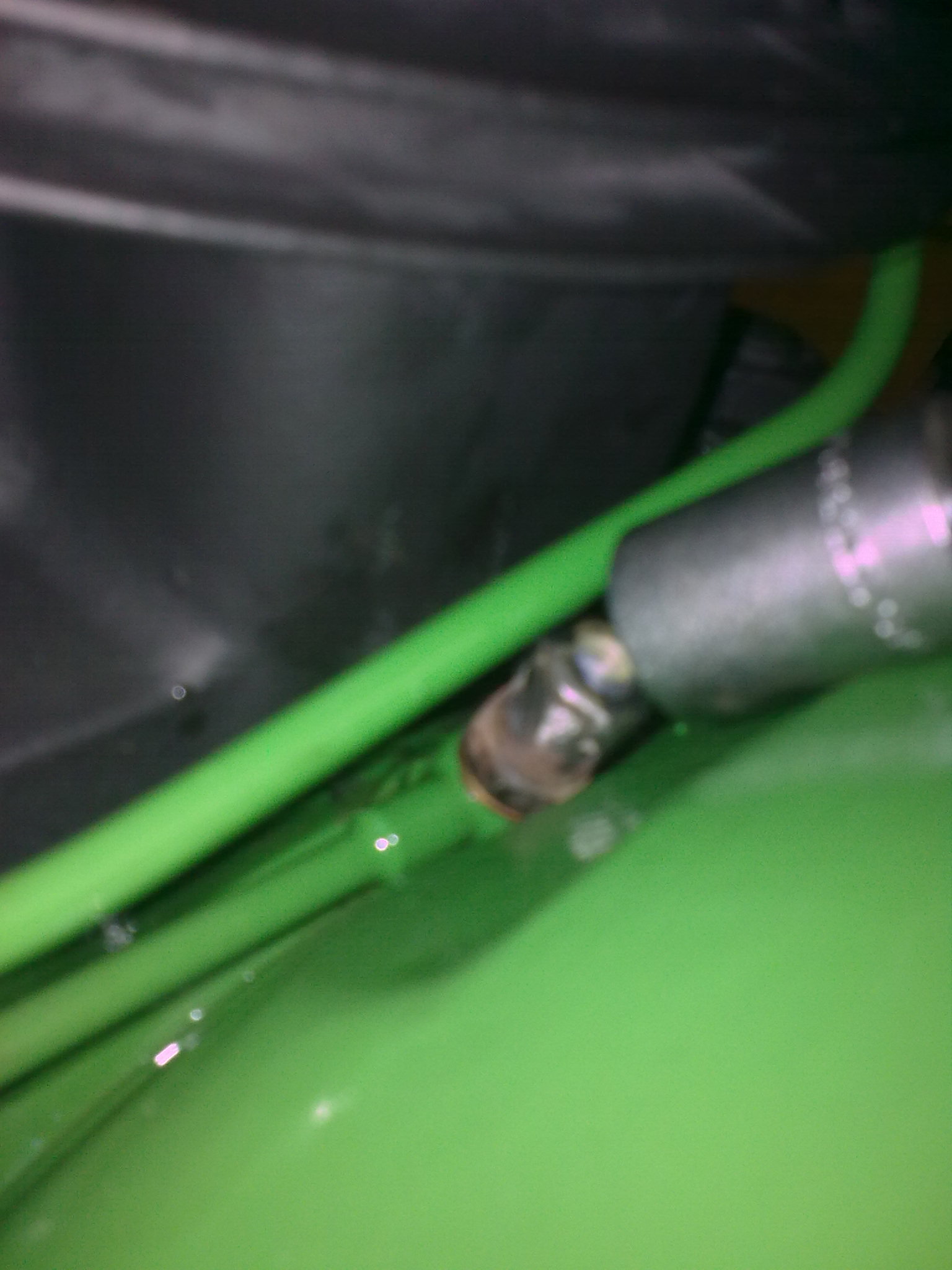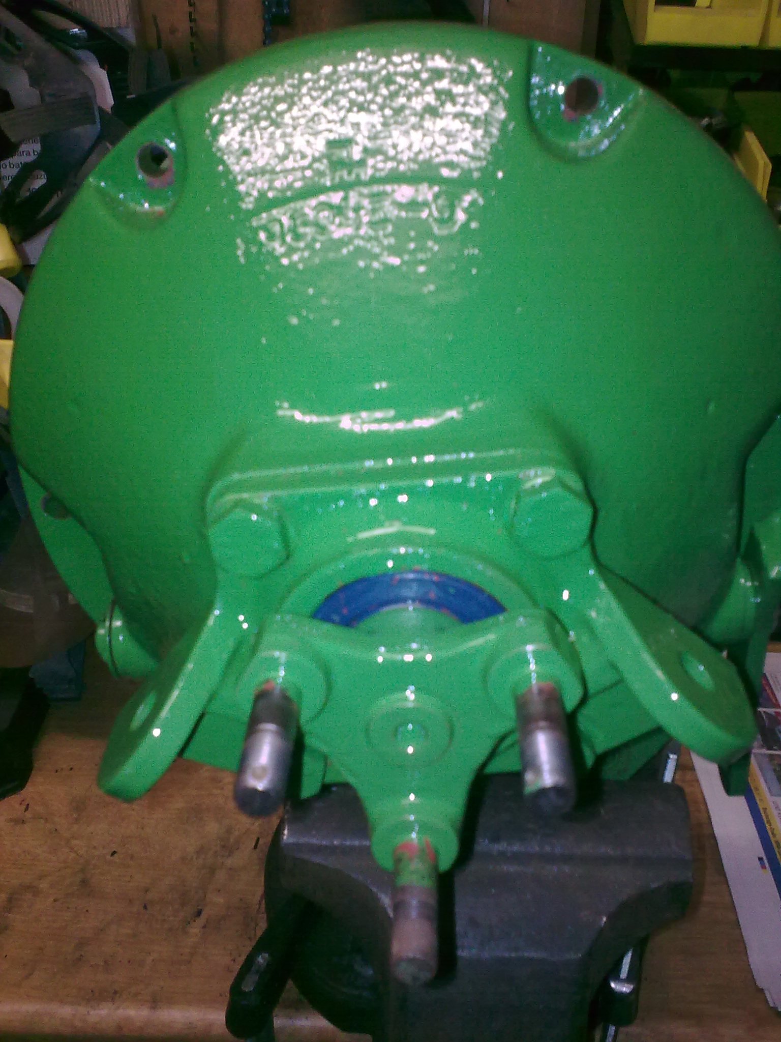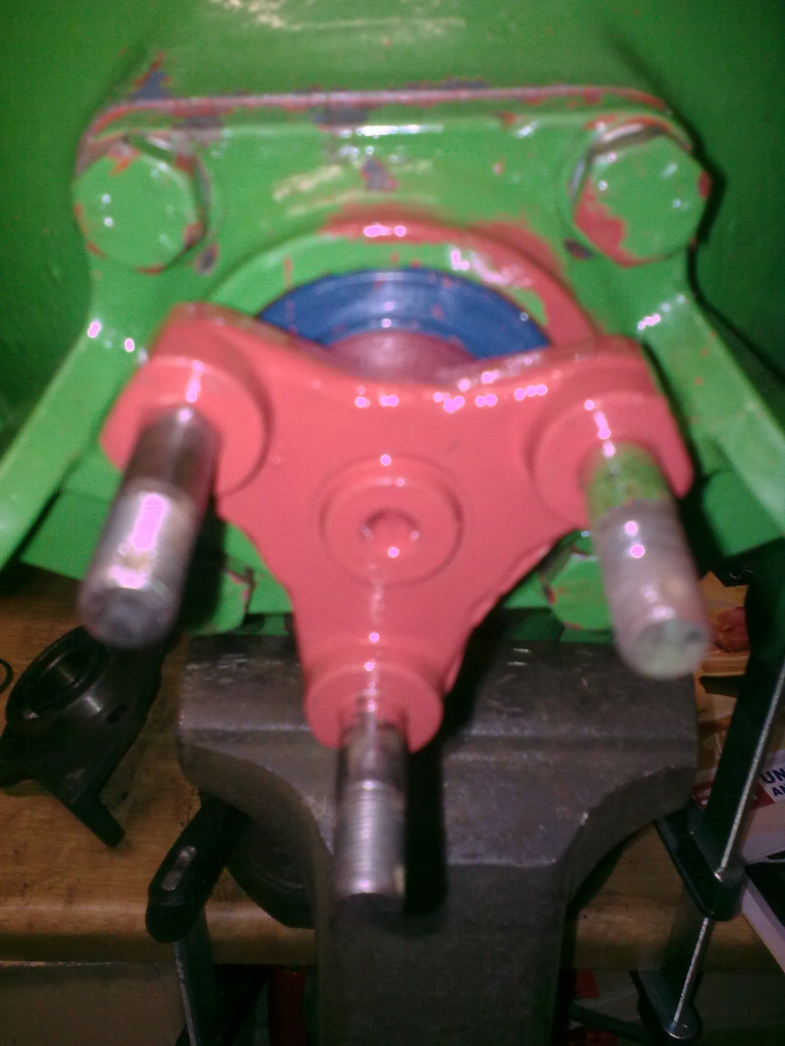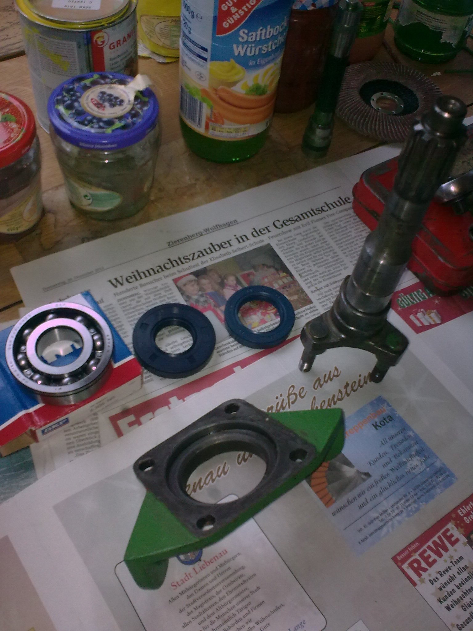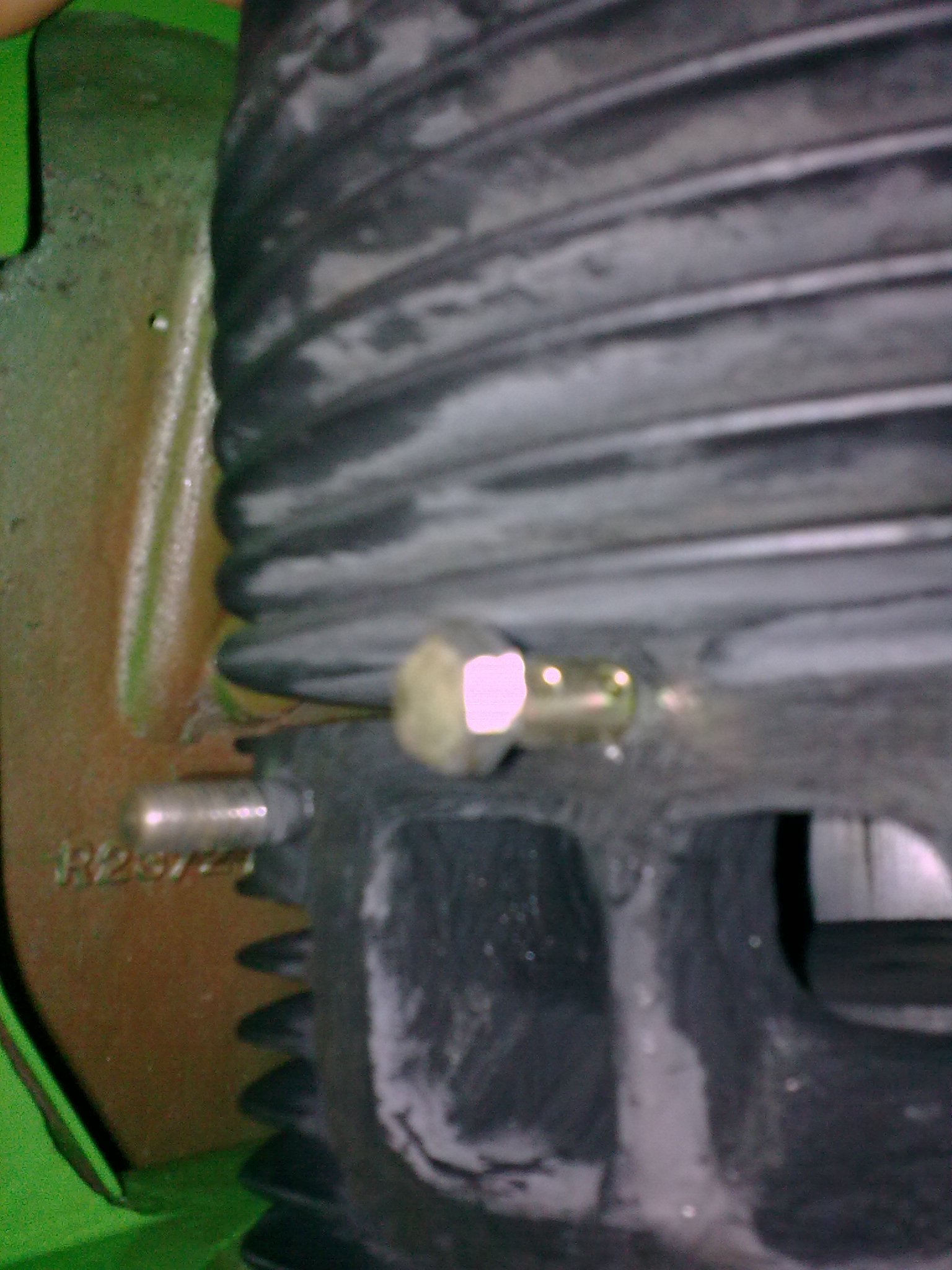 Bevor nun die Luftführungshaube auf dem Zylinder montiert wird ist daran zu denken, erst die beiden Ölleitungen zu entlüften. Lanz sieht das so vor, dass man das Öl von oben in die Leitungen gibt und es an der Pumpe luftfrei austreten soll. Das ist aber zumindest an der Ölleitung zum Kurbelwellenlager sehr umständlich. Es geht auch einfacher. Das erste was ich schon beim Bulli gemacht habe ist, die Ölleitungsverschraubung zum hinteren Kurbelwellenlager zu "tunen". Diese ist ab Werk sehr schlecht erreichbar. Der Trick ist einfach. Es wird oben drauf eine M6 er Mutter geschweißt, die dann ganz einfach von oben mit einer Stecknuss oder einem Steckschlüssel bedient werden kann. Nachdem neue Kupferringe untergelegt sind und die Hohlschraube nur einige Gewindegänge eingeschraubt ist, geht das Entlüften los. Dazu entfernt man vorne an der Pumpe beide Hohlschrauben der beiden Leitungen. Zum Entlüften der Lagerleitung nimmt man jetzt die längere der beiden Hohlschrauben und steckt diese durch eine Ringöse einer selbstgebaute Öldruckleitung und auch durch die Ringöse der Ölleitung zum Lager. Natürlich werden jeweils Dichtringe zwischengelegt. Am anderen Ende steckt man den Schlauch der selbstgebauten Öldruckleitung auf eine Pumpflasche/Spritzflasche. Nun füllt man diese Flasche mit halbwegs dünnem Motoröl, z.B. SAE30. Beim Zusammenpressen entweicht zunächst die Luft aus Flasche und Öldruckleitung und aus der Hohlschraube, die noch nicht an der Ölpumpe festgezogen ist. Nun dreht man die Hohlschraube an der Ölpumpe fest. Vorsicht! Die Leitungen stehen unter Spannung, den Schlüssel erst ansetzen, wenn die Hohlschraube definitiv gepackt hat! Bevor es jetzt an das Entlüften der eigentlichen Ölleitung des Motors geht, wird die Ölleitung vom Öltank zur Ölpumpe an der Ölpumpe angeschlossen und mittels Trichter mit Motoröl gefüllt. Das hat den Zweck, dass sich später die Ölleitungen hierüber nicht wieder Luft "holen" können. Das Drücken der Flasche ist sehr anstrengend, habe ich mir sagen lassen...