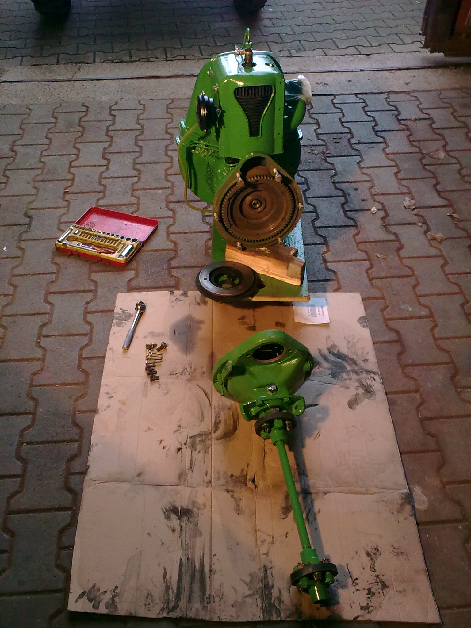 Hier die komplette Antriebsmimik vor dem zusammenschrauben. Danach merkte ich sofort, dass der Ausrückweg der Kupplung nicht befriedigend war. Das das Ausrücklager schon verschließen ist wußte ich vorher schon, aber probieren kostet ja bekanntlich nichts. Nun war mir das aber auch zu heikel, alles einzubauen und nachher zu merken, hmmm, Mist, Kupplung trennt nicht richtig. Nachstellen? Wie denn? Ist doch schon auf der letzten Rille. Also Kupplungsglocke wieder abgeschraubt vom Motor, Ausrücklager ausgebaut und mein Vater ist dann kurz vor Feierabend nochmal los, sich um ein neues Ausrücklager bemühen. Die Firma hatte für uns schon die neue Kupplungsscheibe besorgt. Um die Lieferbarkeit des Ausrücklager zu überprüfen, brauchten sie natürlich den Typ des Kupplungsautomaten. Das Feld wurde also von hinten aufgerollt. Klasse! In der ET- Liste steht K4,5, auf dem Automaten K5. Beides funktioniert. Sicherheitshalber alles aufgeschrieben, ausgemessen und notiert. Irgendwas wird´s schon geben. Hoffentlich. Über den normalen Ersatzteilweg vom Hersteller Sachs ZF hatte die keine Möglichkeit, da ran zu kommen. Also Telefonkonferrenz direkt zum Hersteller. Nach einer halben Stunde und Datenvergleich war man sich einig, das richtige Ausrücklager für die Kupplung gefunden zu haben. "Oh, das ist aber schon lange her, das da mal jemand nach gefragt hat...". Es ist lieferbar. Mitte nächster Woche soll es da sein. Bin schon gespannt wie ein kleiner Flitzebogen, wie das dann im Neuzustand aussieht und wie hoch der Graphitring dann aus dem Träger ragt, vermutlich höher als zwei Millimeter...