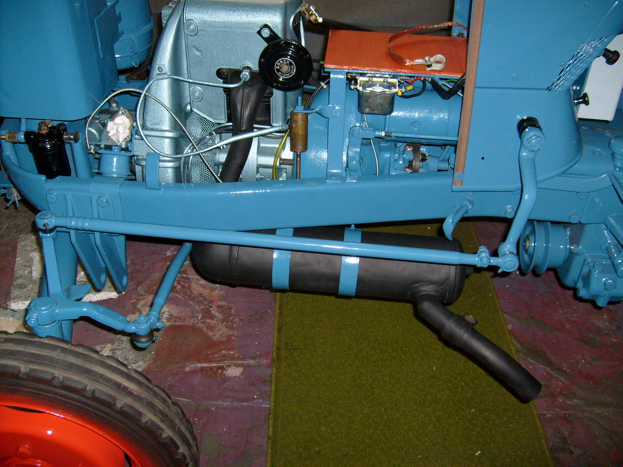 Beim Prototyp kommt das Auspuffrohr direkt hinten aus dem Deckel raus.Sieht man schön in der Betriebsanleitung des Bulli. Bei der frühen Ausführung schon so wie im Bild, dass Auspuffrohr kommt jetzt aus dem Schalldämpfer seitlich raus. Damit ist die wöchentliche Reinigung des Schalldämpfers vereinfacht, weil sich der hintere Deckel leichter ab- und wieder anbauen läßt. Bei der späten Ausführung ist das Abgasrohr verlängert und verschwindet unter dem linken Trittblech. Somit konnte eine bessere Luftqualität für den Fahrer erreicht werden, vor allem bei ungünstigem Wind, und gleichzeitig eine weiter geminderte Lärmbelastung. Der D1206 übernahm dann diese letzte Auspuffausführung bis zum Ende der Produktion ca. März 1960.