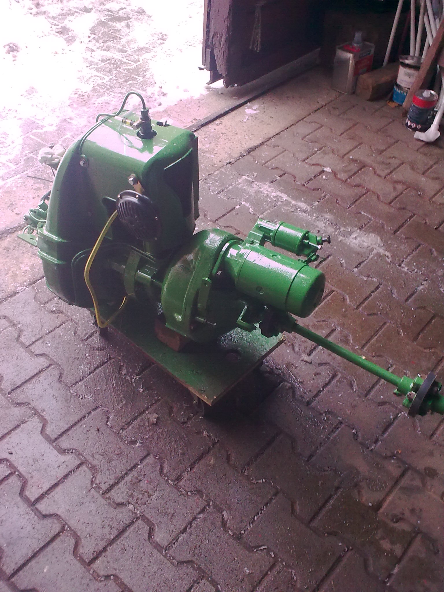 Nur soviel: Anstatt des elektrischen Aufzuges wie beim Einbau haben wir den alten Flaschenzug aus unserer ehemaligen Getreidemühle reaktiviert, der schon schwere Mühlenmaschinen und Teile vom 75 PS Herforder Schwerölmotor am Haken hatte. Das Rasenmäherseil kam jetzt auch wieder zum Einsatz plus Zurrgurt. Ich hatte aber zu weit vorausgedacht und zuviel am Schlepper montiert. Die Batteriehalterung mußte nochmal gelöst werden und ca. 45 Grad nach oben gekippt werden, damit die Antriebswelle mitsamt Anlasser und Kupplungsglocke darunter eingefädelt werden konnten. Außerdem waren die beiden vorderen Gummilager mitsamt Halterungen im Weg. Der Einbau gestaltet sich knifflig wegen der beiden Ölleitungen, die nicht beschädigt werden dürfen.