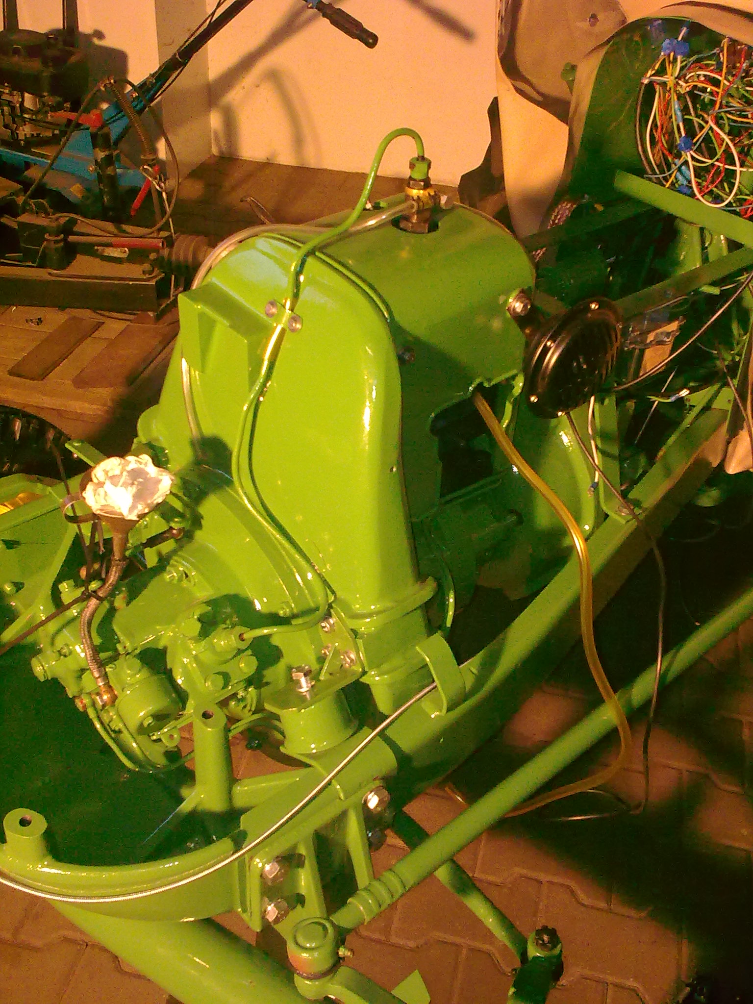 Heute habe ich noch den Motor fertig verkabelt, den Abstellerbowdenzug am Regler verbaut und den Tank mit Luftfilter wieder montiert. Dabei wurde der neue Öl- und der Dieselschlauch mit angeschlossen. Wichtig: Bevor der Ölschlauch an der Ölpumpe festgezogen wird muss dieser entlüftet werden. man kippt also Motoröl in den Öltank und wartet bis es am Zulauf der Ölpumpe luftfrei aus der Leitung kommt. Erst danach die Leitung an der Ölpumpe festziehen. Das alte Pluskabel zwischen Anlasser und Batterie wurde gegen ein neues getauscht.