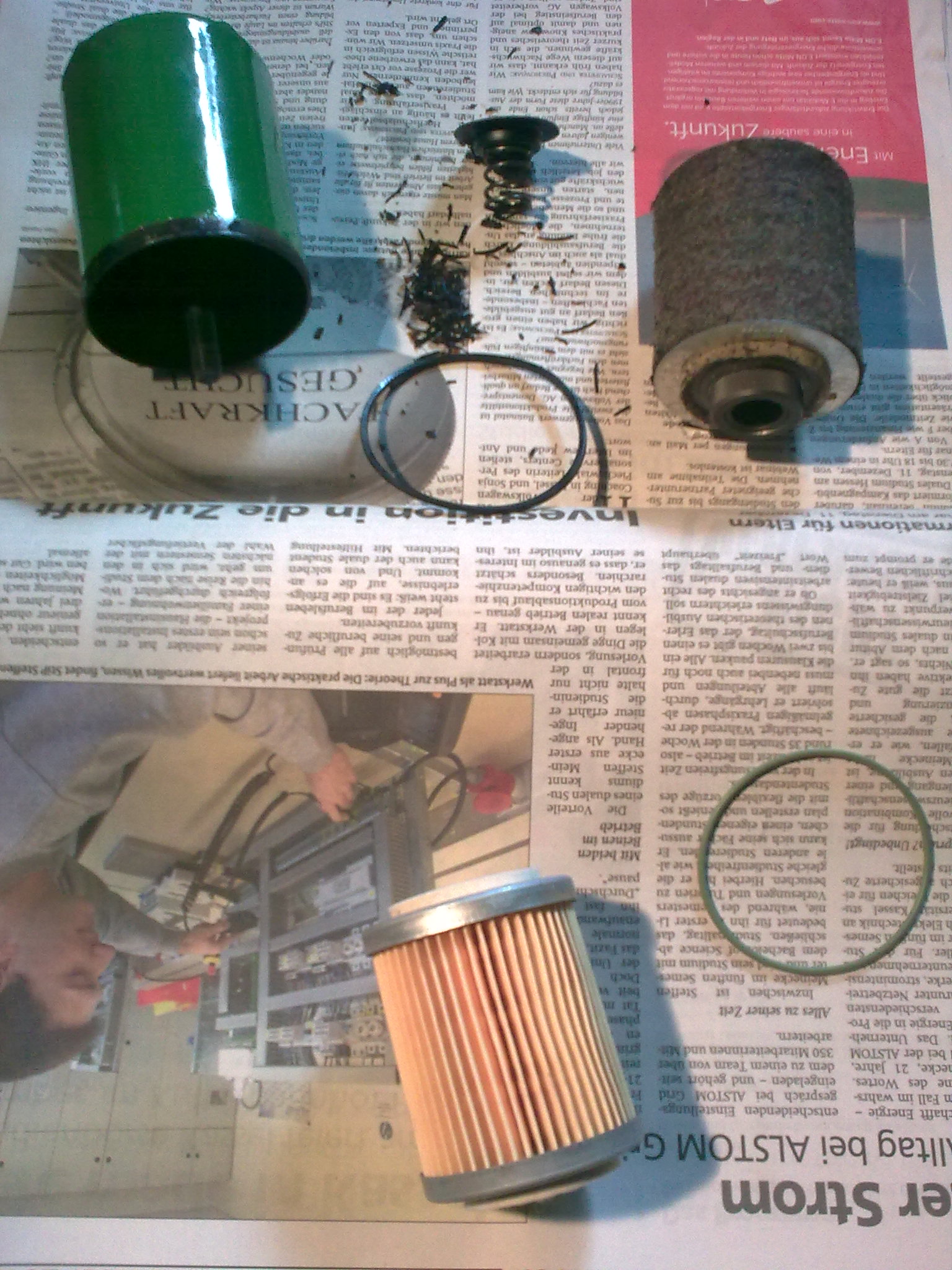 Das Kraftstofffilter wurde zerlegt und es fanden sich alle Teile darin vor die rein gehören. Sehr gut! Oftmals fehlt z.B. die untere Feder mitsamt Teller und Filzring, die den unteren Teil des Filter gegen den Stehbolzen abdichtet. Der Schlepper muss wohl viel im Nadelwald im Einsatz gewesen sein oder der Schlepper stand beim auftanken unter einem Nadelbaum. Im Tank fanden sich eine handvoll Nadeln und im Kraftstofffilter natürlich auch. Auf dem Bild kann man dies erkennen. Das Kraftstofffiltergehäuse wurde mit Aceton ausgewaschen, vorher mußte noch feste Kruste am Boden des Bechers mittels Schraubenzieher entfernt werden. Auf dem Bild sieht man das alte Filterelement, die Feder mit Teller und Filzring sowie den neuen Einsatz und den neuen Dichtring. Der alte Dichtring sah noch nicht mal schlecht aus und wird auf jeden Fall aufgehoben. Das alte Filterelement natürlich auch. Bei der Montage des neuen Dichtringes habe ich erst Silikondichtmasse an vier Stellen in die Nut des oberen Filtergehäuses geschmiert, damit beim Einbau über Kopf der neue Dichtring nicht herausfallen kann. Bei der Montage des Filters fiel mir auf, dass der untere Filzring nicht mehr genügend gegen den Stehbolzen abdichtet. Schmutz würde so unweigerlich von unten in das innere des Filters angesaugt und dieser somit unwirksam werden. Die Lösung ist einfach. Man nimmt einen passenden O- Dichtring der ganz stramm über den Stehbolzen geht und steckt ihn auf den Stehbolzen. Jetzt steckt man die Feder samt Teller und Filzring auf den Stehbolzen. Nun wieder einen Dichtring von oben auf den Filzring. Beim Zusammenschrauben mitsamt neuem Filtereinsatz drücken sich die beiden O- Ringe in den Filzring und dichten wieder komplett ab.