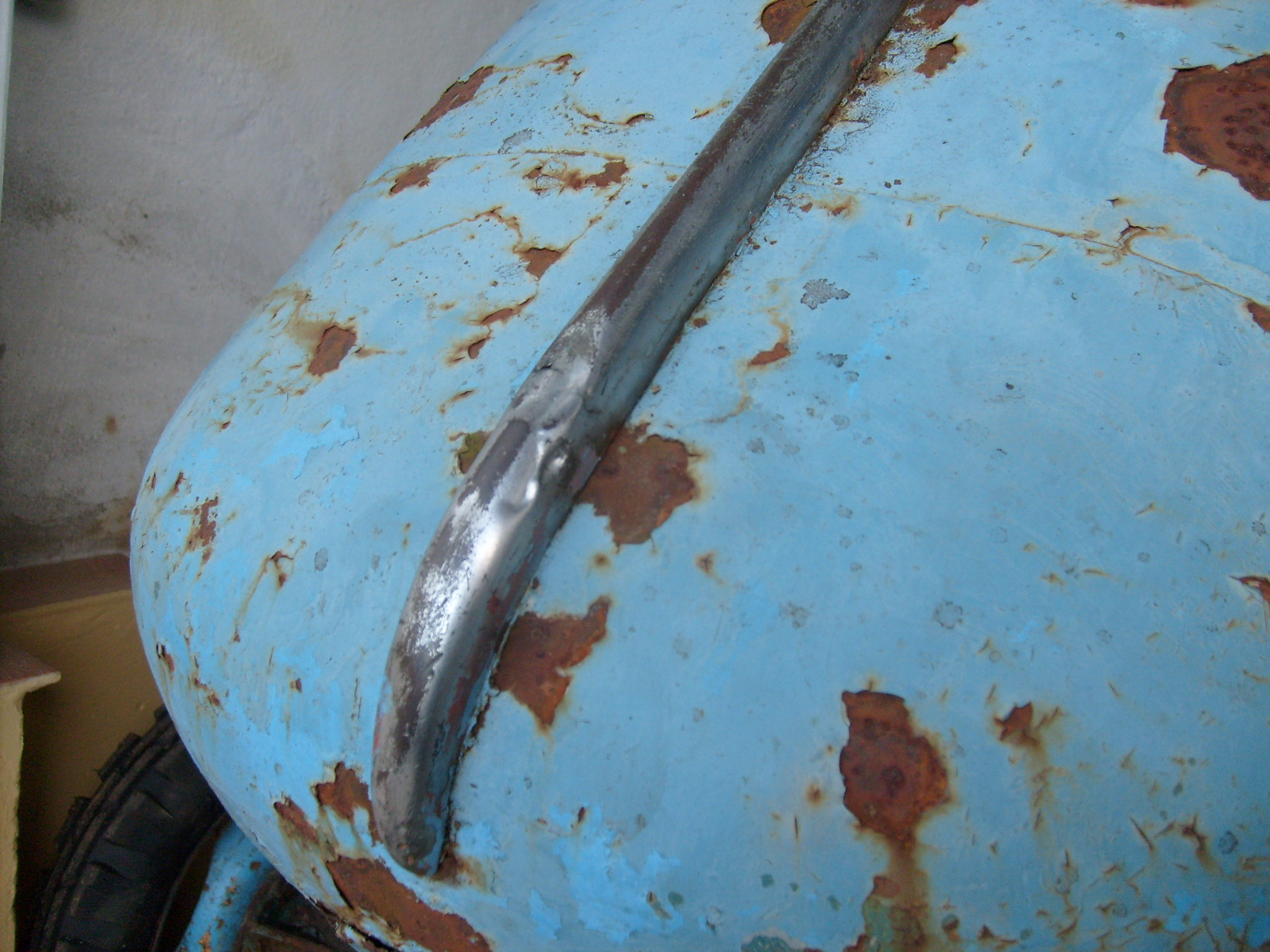 Der einzig verbliebene Vorderradkotflügel sieht auf der Innenseite auch nicht wesentlich besser aus. Der Vorderradkotflügel von der linken Seite liegt vermutlich irgendwo im Wald, ca. 50 bis 100 km südöstlich von Mannheim. Wer ihn findet kann sich ja mal bei mir melden, außer Versand zahle ich auch nichts dafür! :lol: