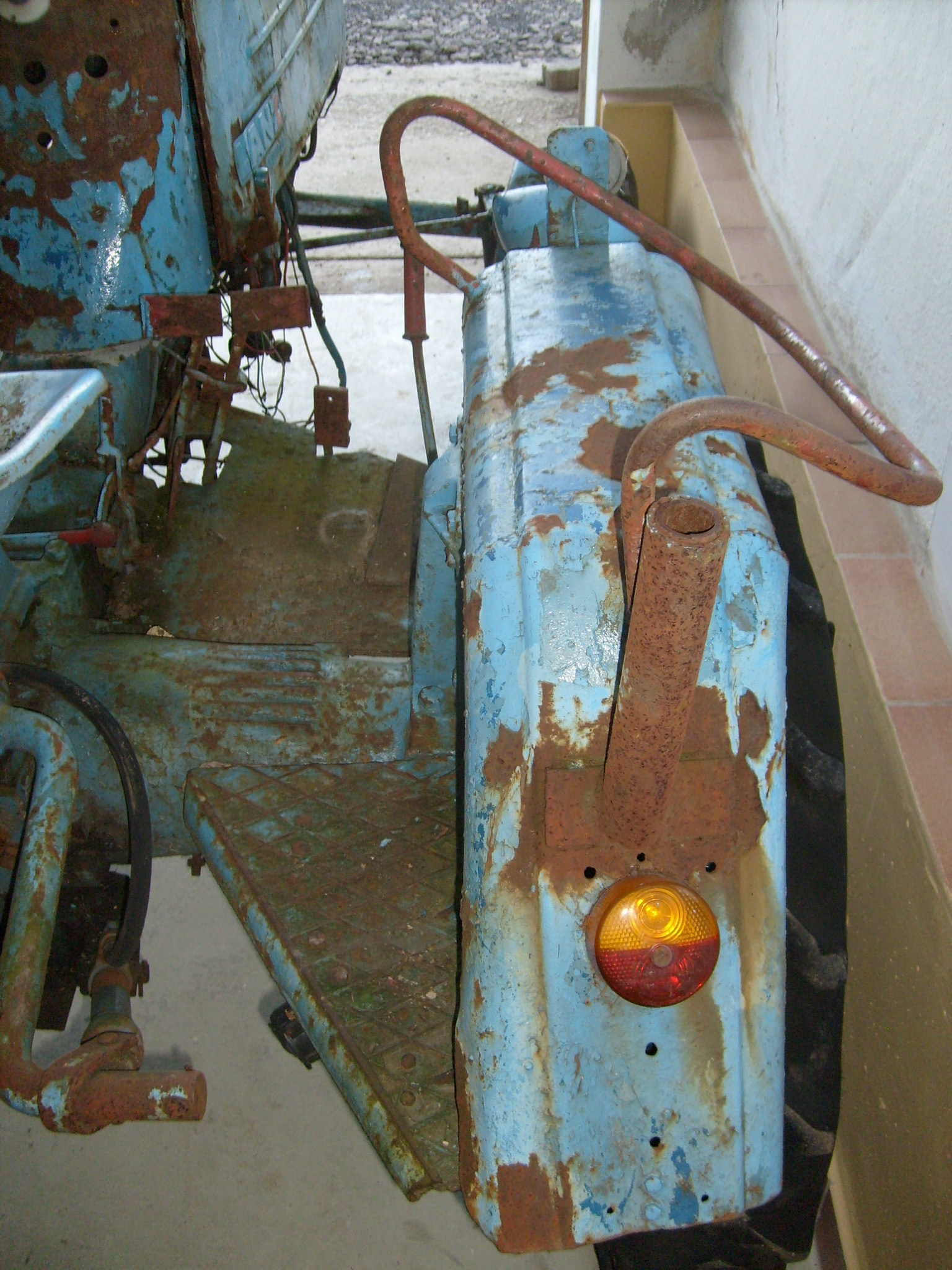 Am rechten Hinterradkotflügel hat man in der Vergangenheit ein Rohr angeschweißt. Vermutlich die Aufnahme für den nicht mehr vorhandenen Überrollbügel? Die Rückleuchten sind flach auf die Kotflügel geschraubt. Wer benötigt schon Lampenhalter?