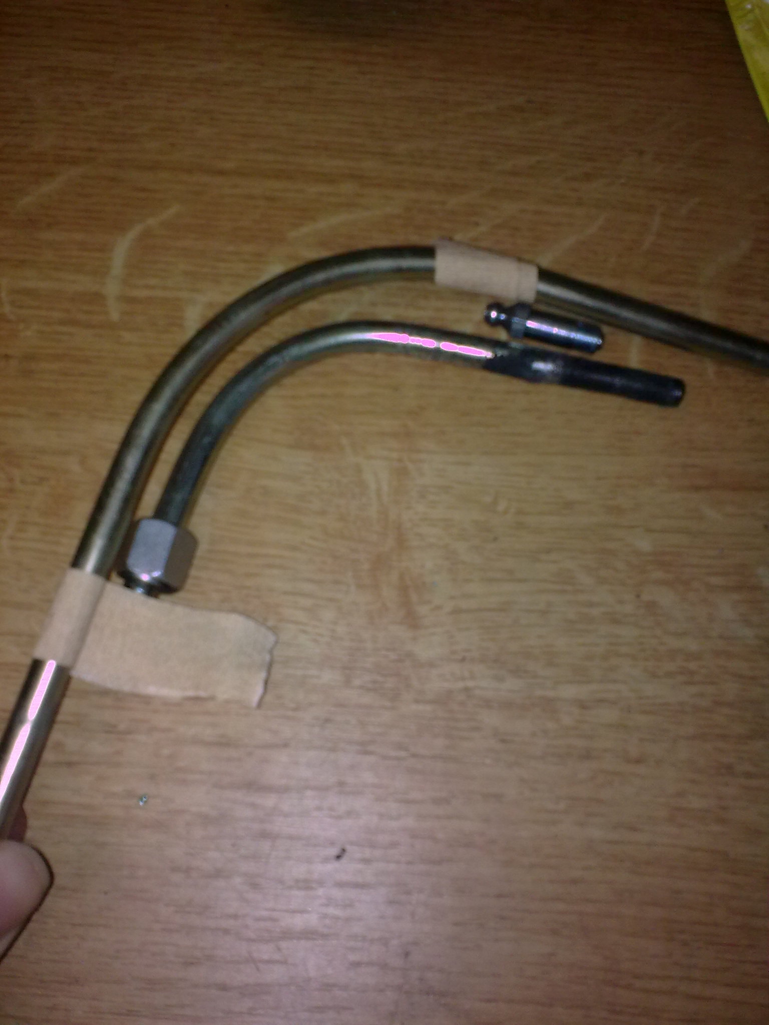 Dieses Bild zeigt die Idee Nr.1: Unten mit M8 mal 1 Gewinde (nicht konisch) direkt auf dem 90 Grad Röhrchen. Problem war hier, dass das Öl durch das Gewinde lief und über dem Auspuffkrümmer abtropfte. Direkt darüber sieht man die Idee Nr.2 im Schema: Ein aufgebohrter M8 mal 1 Schmiernippel mit konischem Gewinde wird an das 90 Grad Röhrchen gelötet. Die Abdichtung am Gewinde im Zylinder war prima, der Rest nicht so doll. Das Klebeband gibt mir die Länge vor wo ich den Rest des Röhrchens abtrennen muss, damit nach dem Zusammenlöten wieder die Richtung und die Flucht mit dem restlichen Ölablauf am Schlepper zusammen paßt.