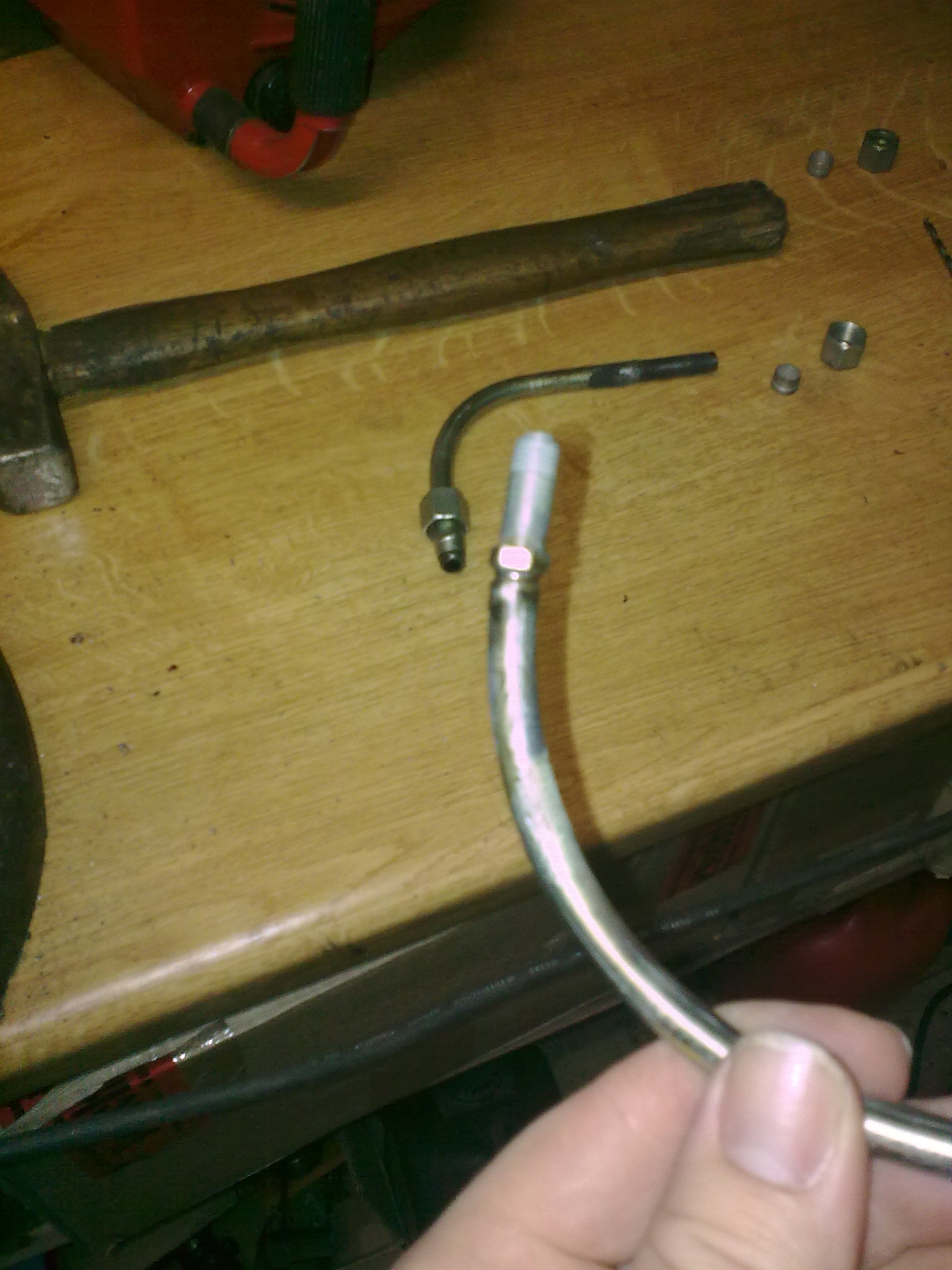 Das wurde dann verlötet mit dem Ergebnis das es zwar optisch top aussah ich aber technisch gesehen nicht zufrieden war. Idee Nr. 3 wurde geboren und heute in die Tat umgesetzt. Die Zutaten: Schmiernippel M8 mal 1 mit konischem Gewinde, Ölablaufröhrchen gerade, Schneidring- Verschraubung, eine Mutter M10 in flacher Ausführung.