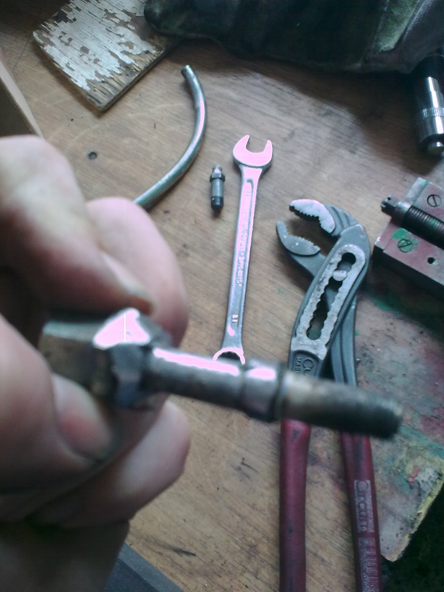 Mal wieder etwas Neues vom Ackermoped. Der TÜV- Termin im März naht und ich kämpfe immer noch mit der Undichtigkeit am Ölablaufrohr. Auch mein zweiter Versuch mittels Ofendichtmittel, dass bis zu 1500 Grad aushält, konnte das Öl letztendlich nicht stoppen. Das liegt natürlich nicht an der Temperatur, aber vermutlich an der Konsistenz nach dem Trocknen. Wäre es geschmeidig geblieben wäre es wohl auch dicht geblieben. Aber nach dem Trocknen bröselte es ähnlich wie Ölkohle. Wieder alles zerlegt und mit einem Drahthaken das Ofendichtmittel rausgekratzt. Abschließend alles mit Bremsenreiniger zum x-ten male entfettet und nach einer Lösung gesucht. Jetzt habe ich mir einen Schmiernippel M8 mal 1 mit Schaft gekauft. Das Gewinde ist leicht konisch, 7mm lang und wird mit Gewindedichtmittel in den Zylinder geschraubt. Die Kugel wird entfernt und der Schmiernippel mit einem 3mm Loch versehen. Auf den Kopf löte ich dann wieder ein um 90 Grad gebogenes Röhrchen, was mit Schneidring und Überwurfmutter versehen ist. Der Ablauf bleibt also an sich gleich und das Röhrchen kann nach wie vor zwecks Reinigung aus dem Zylinder geschraubt werden. Der Schmiernippel ist durch den Schaft insgesamt 30 mm lang, so das man mit dem Schlüssel bequem an den Sechskant des Schmiernippels herankommt und diesen anziehen oder auch wieder abschrauben kann, ohne jedesmal die Schallisolierung, die Einspritzleitung und die Zylinderabdeckhaube entfernen zu müssen.