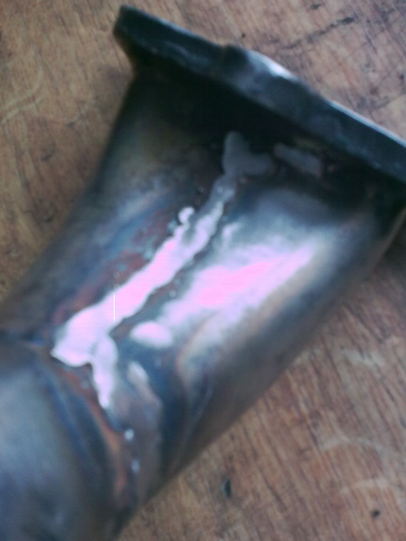 Der Flansch am Krümmer ist angelötet, werkseitig. Es ist wichtig, dass man bei der Demontage und vor allem bei der Montage nach dem Reinigen des Schalldämpfers erst die Klemmschellen am Schalldämpfer löst und auch die Verschraubung der Klemmschellen am Kupplungsgehäuse. Tut man dies nicht verkantet sich der nur 5mm starke Flansch beim anziehen der drei M8 Muttern und wird bei gewissenlosem festziehen der Muttern innen hohl, so dass die beste Krümmerdichtung nicht mehr abdichten kann. Beim Kauf des Schleppers war das aber alles dicht und hat nicht geölt. Der Grund? Der Spalt im verzogenen Flansch hatte sich irgendwann selbst abgedichtet, mit Ölkohle! :D Nach der Reinigung und dem Ausbrennen war das natürlich alles hinfällig. Das Öl was unten am Auspuff abtropfte kam von der gerissenen Schweißnaht auf der Rückseite des Krümmers zwischen Krümmerflansch und Schalldämpfer. Der Krümmer ist beim D1106 und D1206 aus zwei Blechteilen zusammengeschweißt und nicht aus Guss, wie z.B. beim Alldog. Die Lötnaht hatte auch einen Riss durch fehlerhafte Montage in der Vergangenheit bekommen.