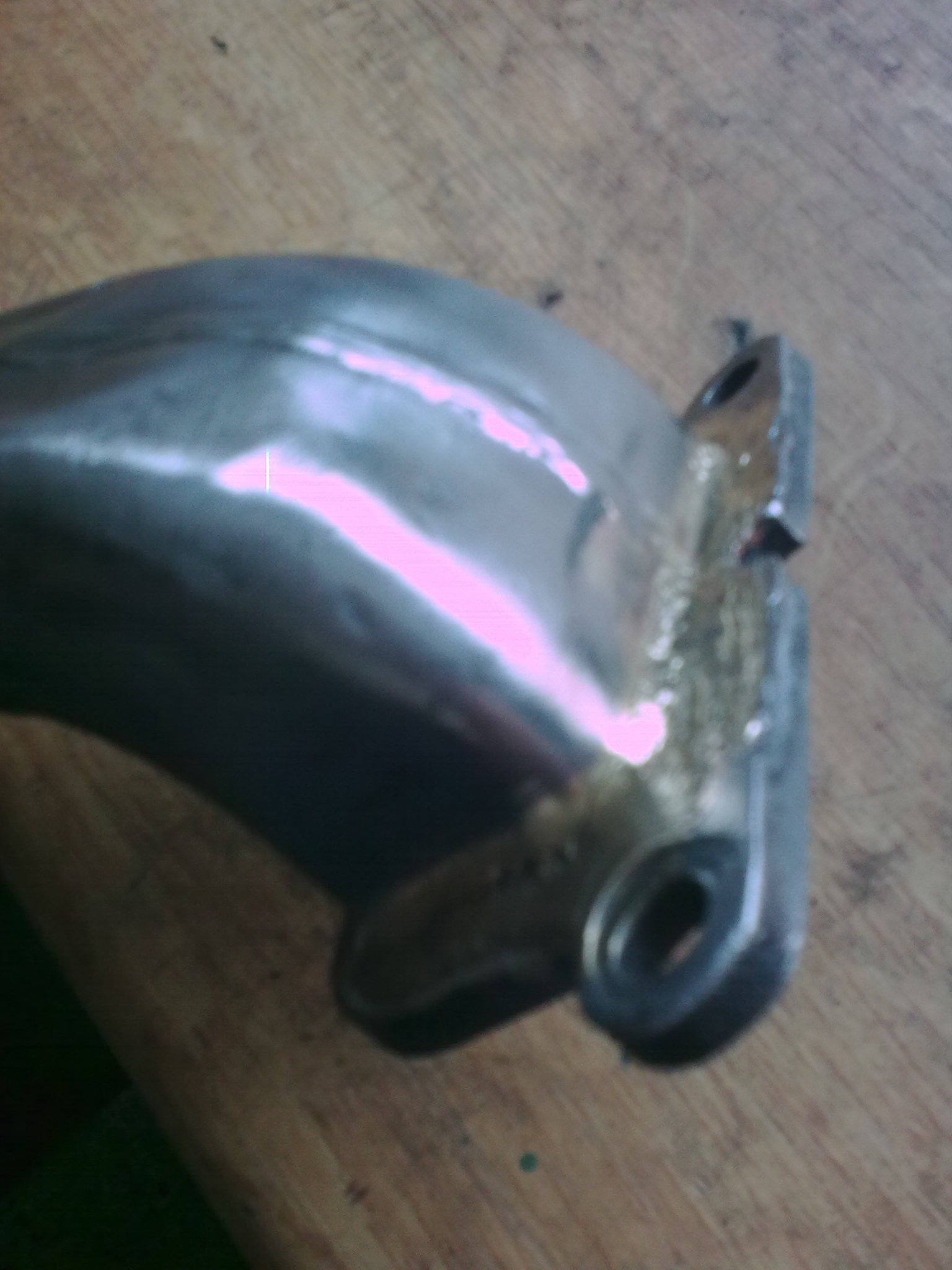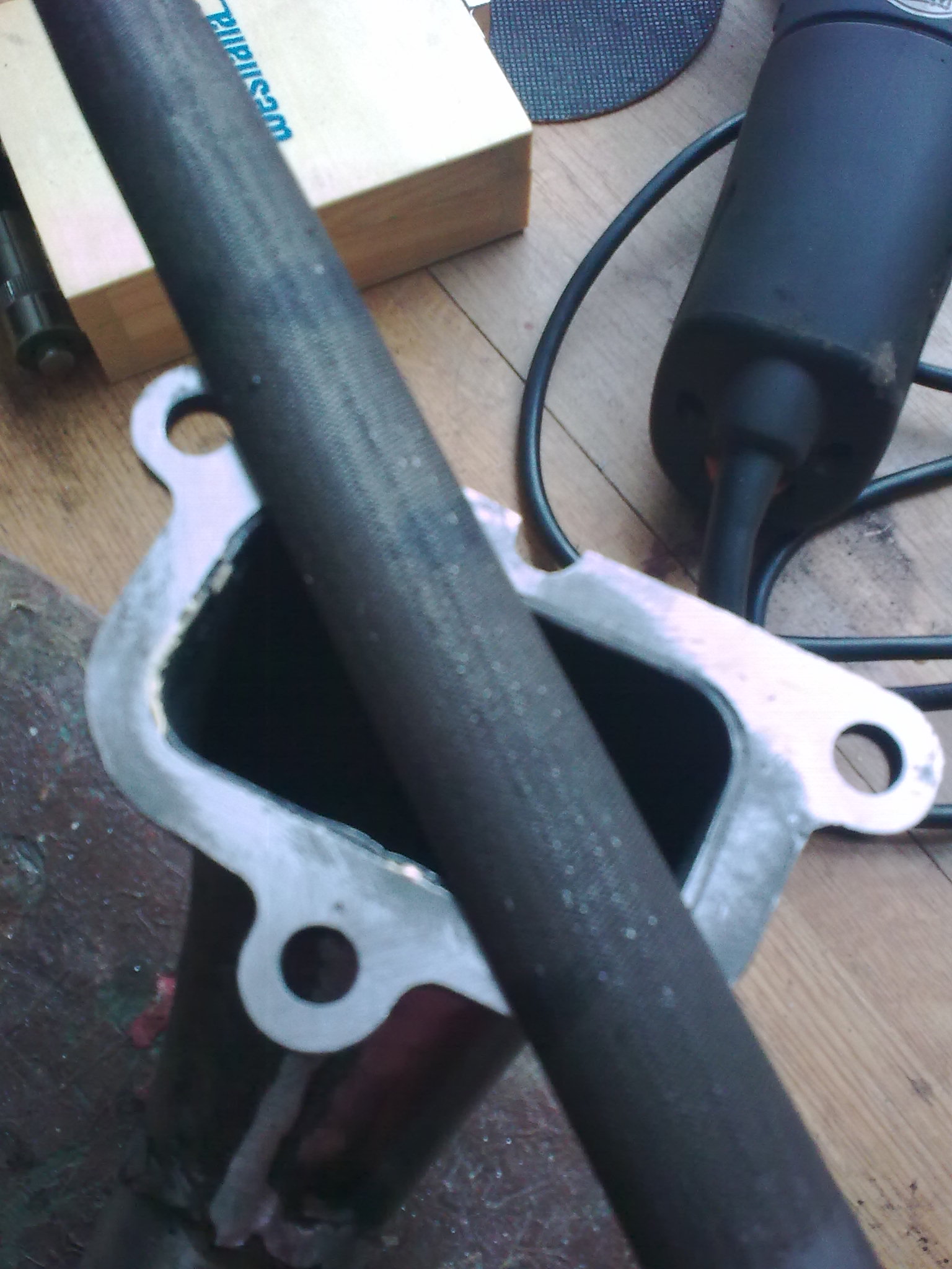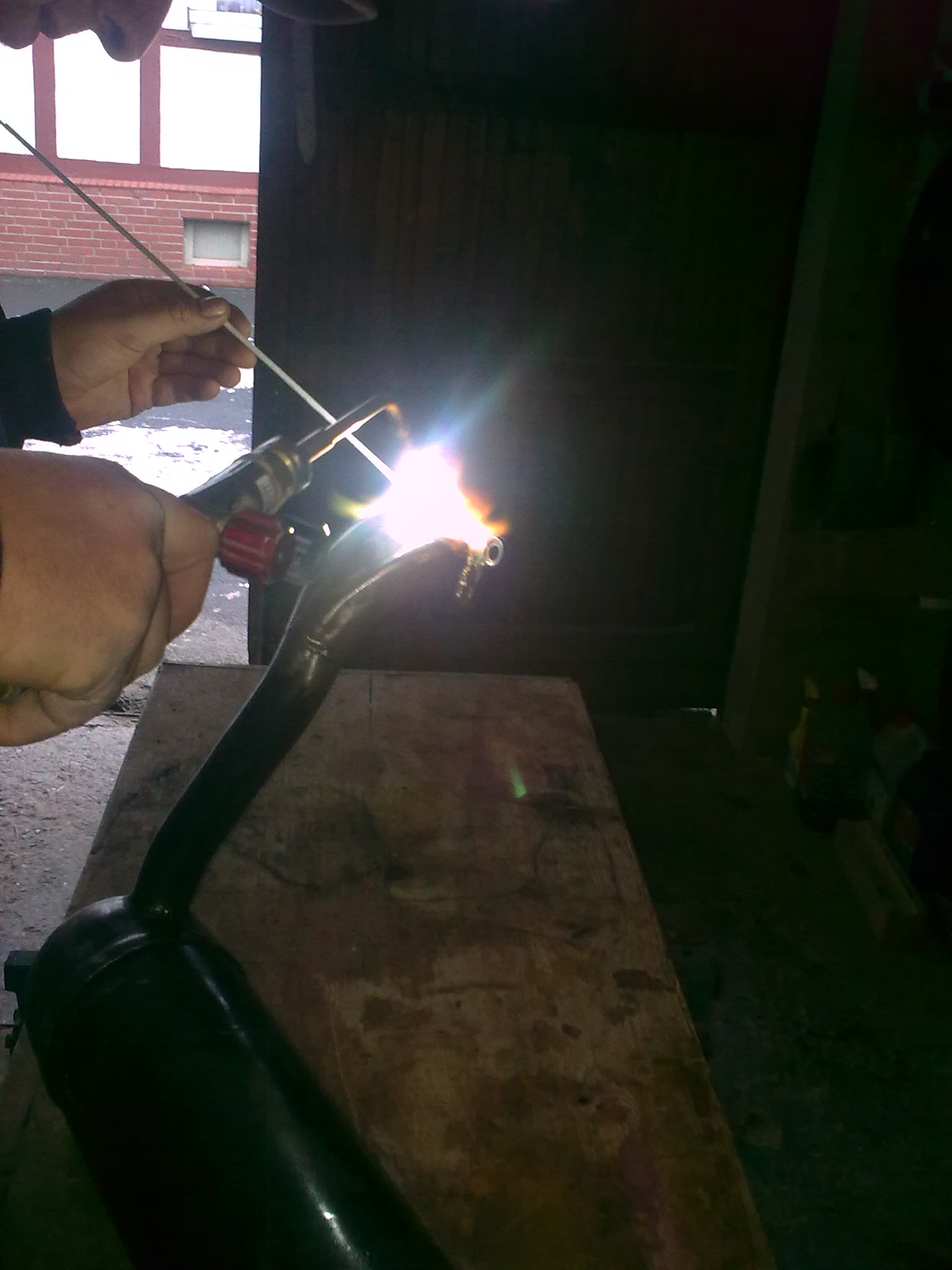 Der Flansch wurde rundherum neu verlötet. Ist mitlerweile schon wieder 5 Tage her. Nach der Montage war das auch alles schön dicht. Nur unten an der Schweißnaht auf der Rückseite hatte ich einen kleinen Riss übersehen. Nach einer halben Stunde Probelauf fing es da an rauzusabbern. Also Auspuff zum xx-ten male abgeschraubt, entfettet, geschweißt. Hier mal ein Bild vom Löten: