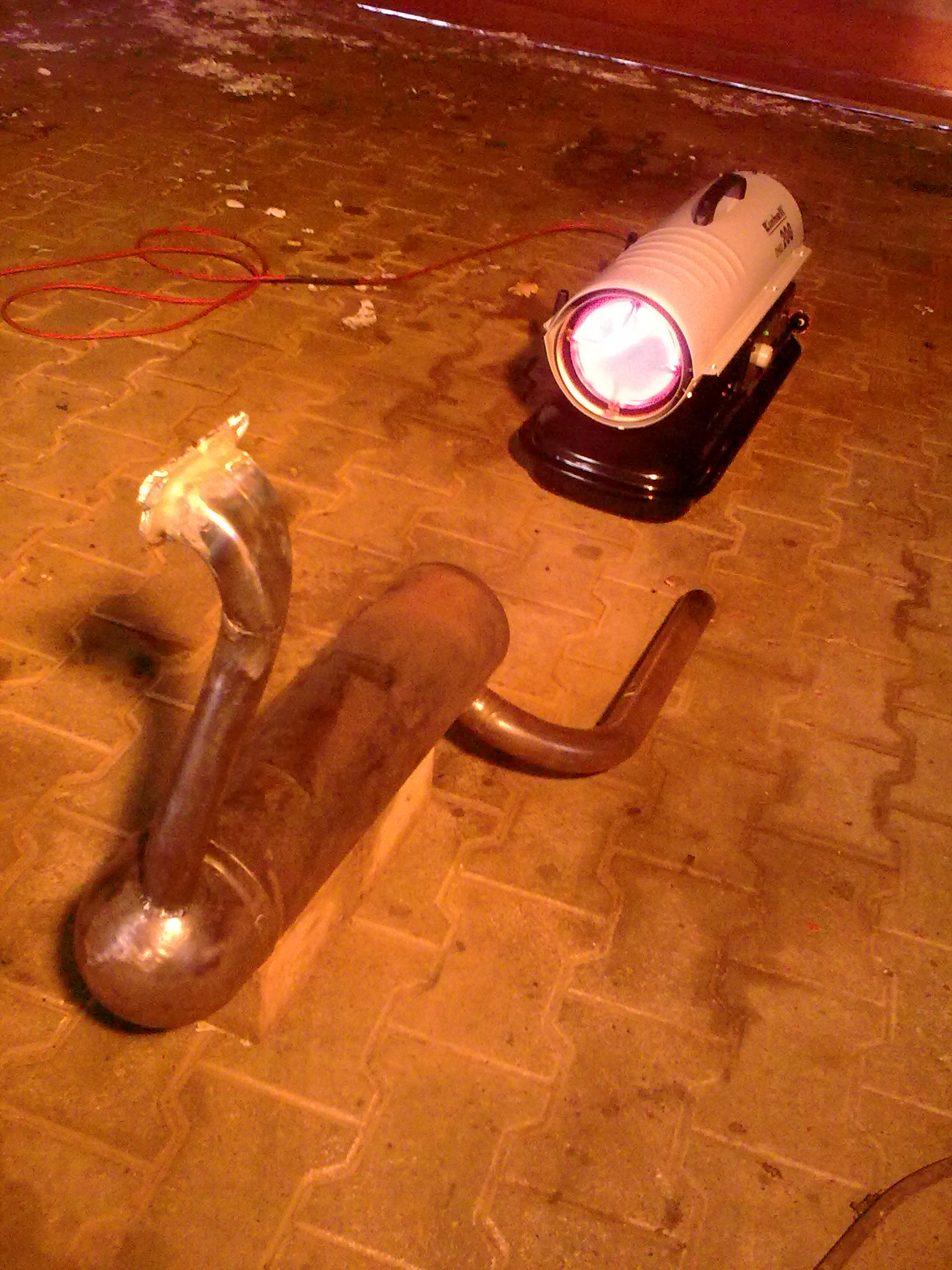 Mitlerweile war der neue Auspufflack nicht mehr schön anzusehen, so dass ich nochmal alles komplett abgebürstet und neu lackiert habe. Da selbst in der Scheune die Temperatur zu diesem Zeitpunkt gerade mal über Null Grad war, habe ich den Auspuff mit einem Heißluftgenerator auf Lackiertemperatur gebracht: