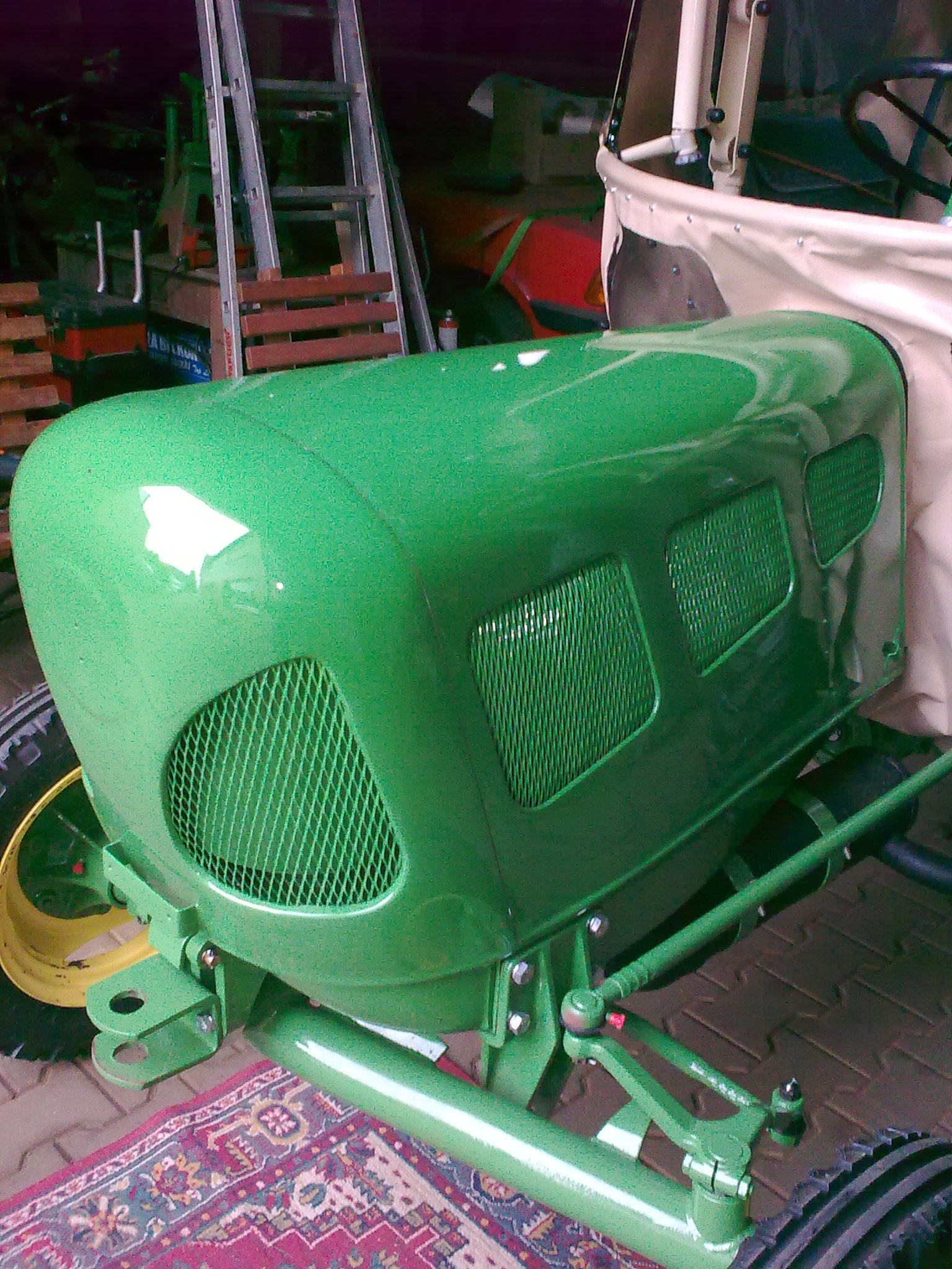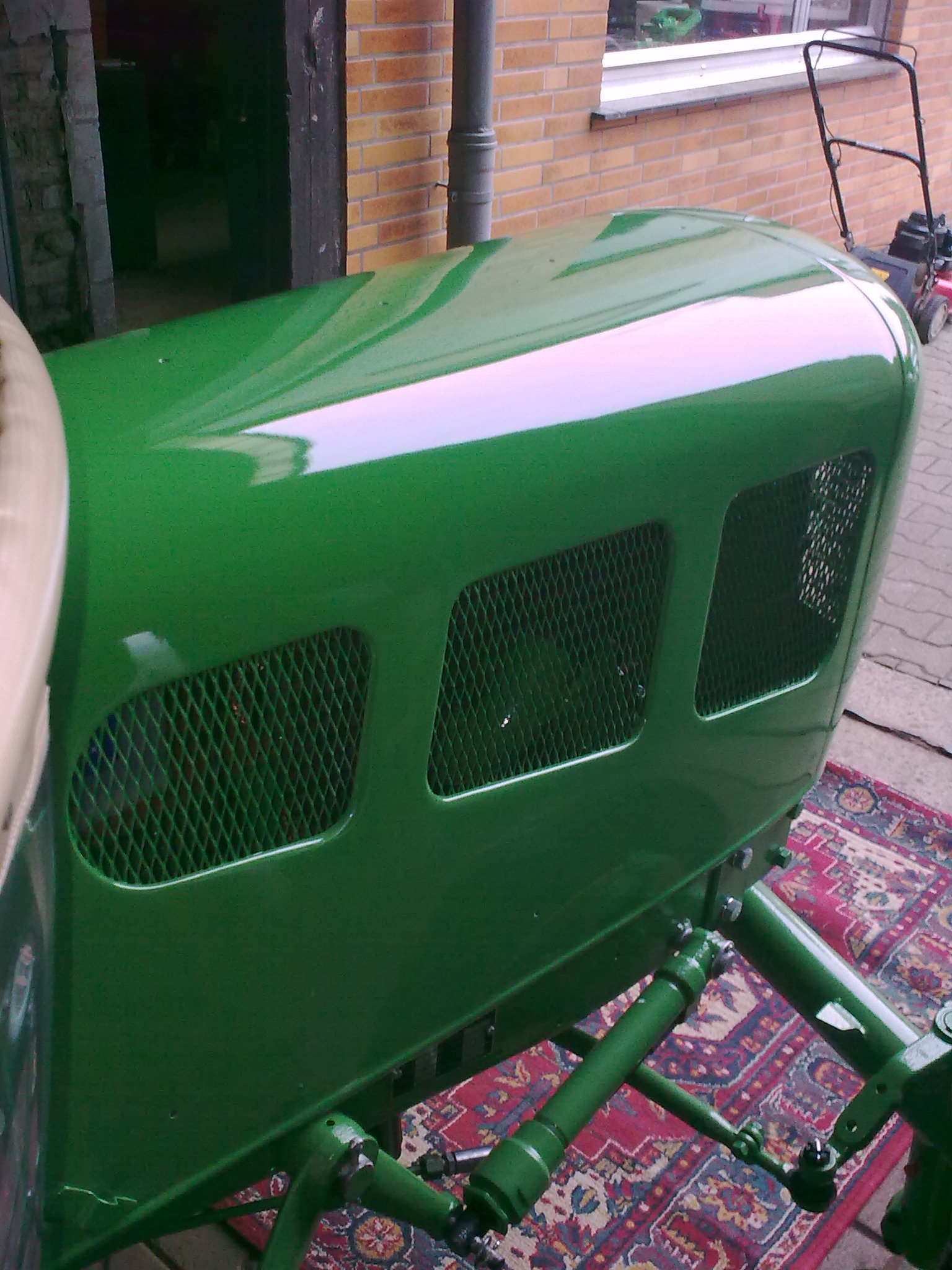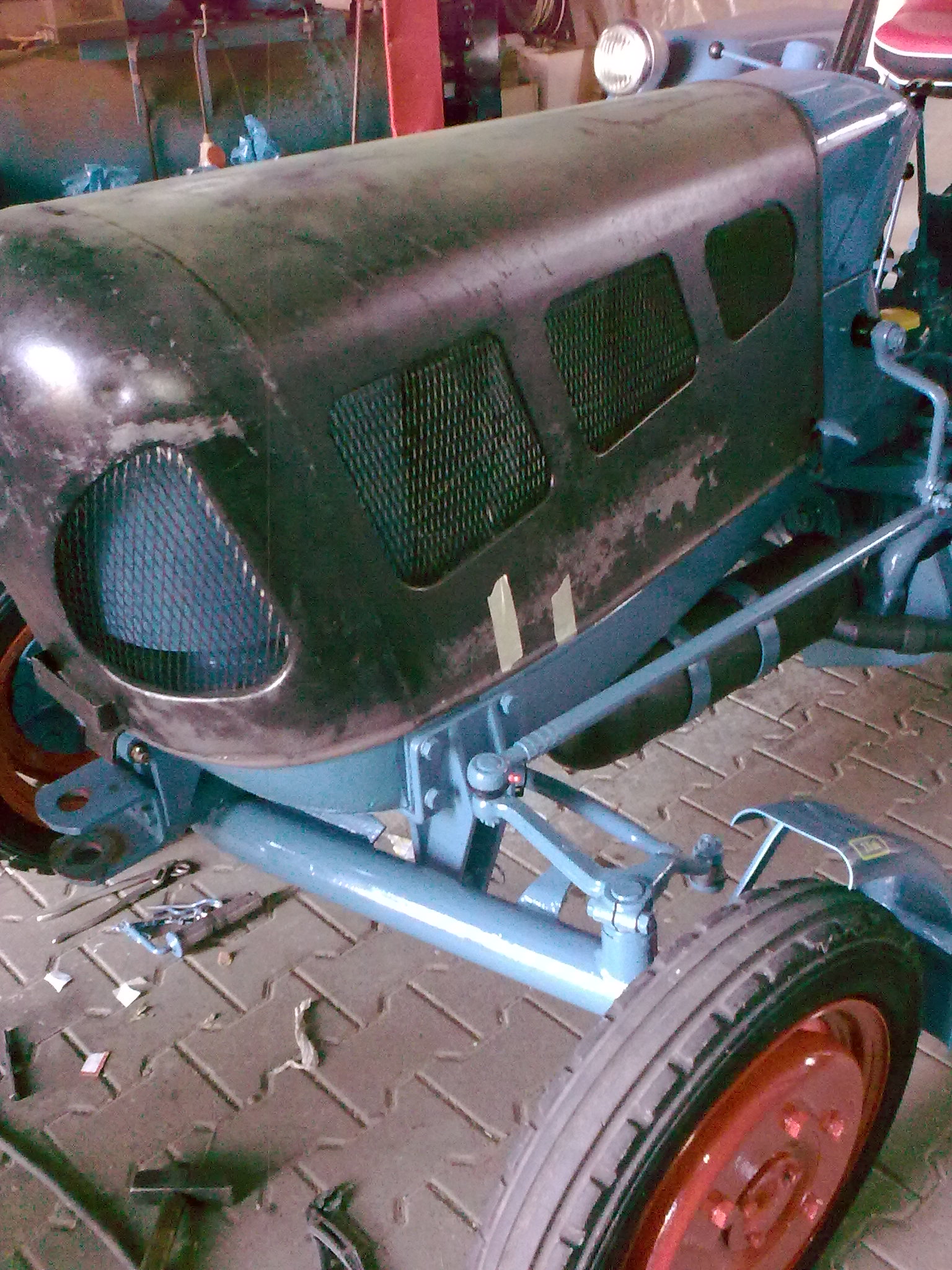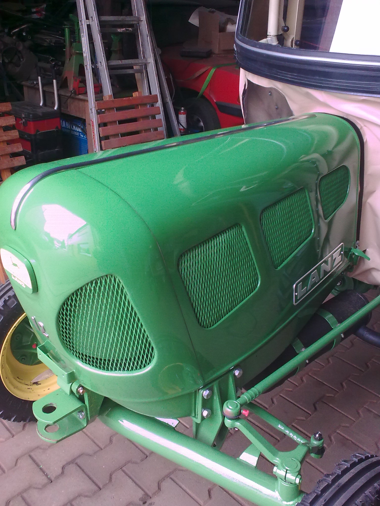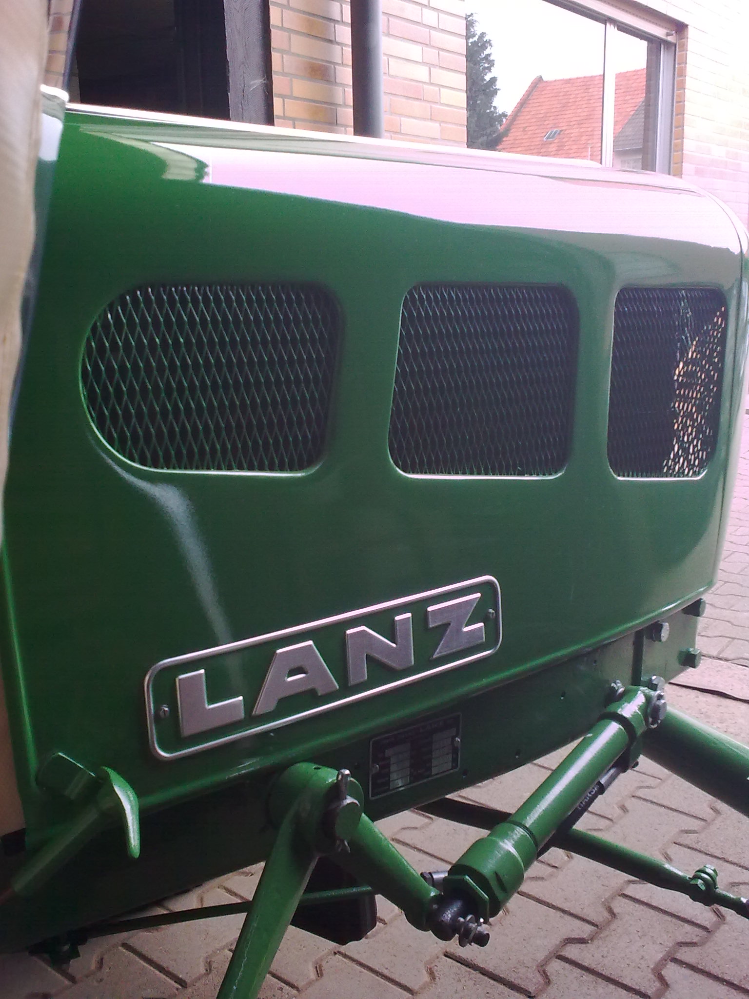 Heute haben wir die lackierte Motorhaube auf den Schlepper gesetzt. Morgen möchte ich den Zierrat anbringen.