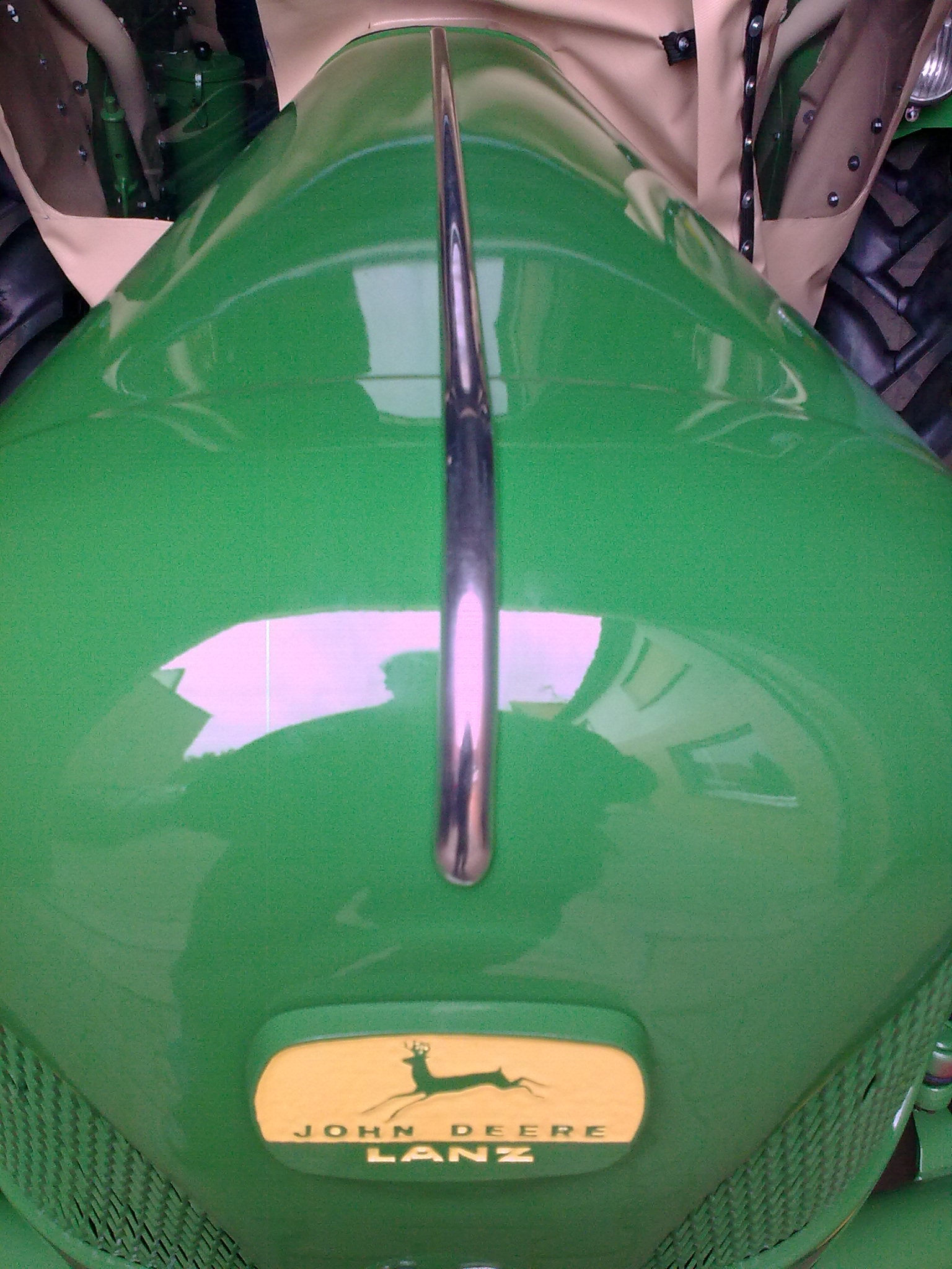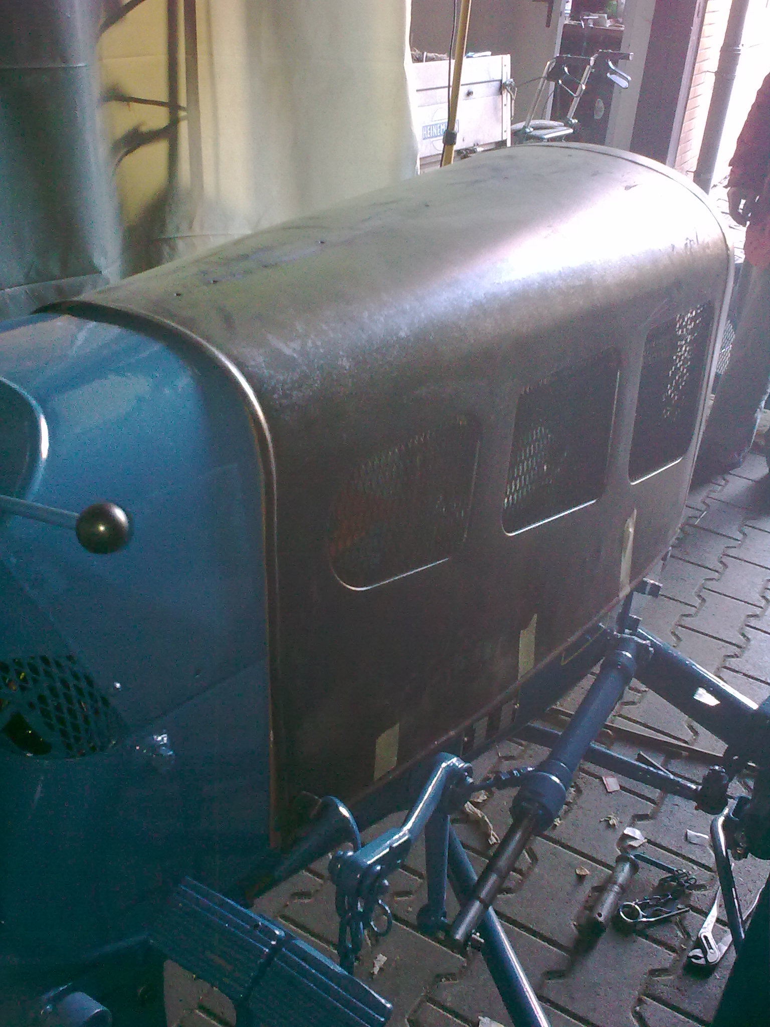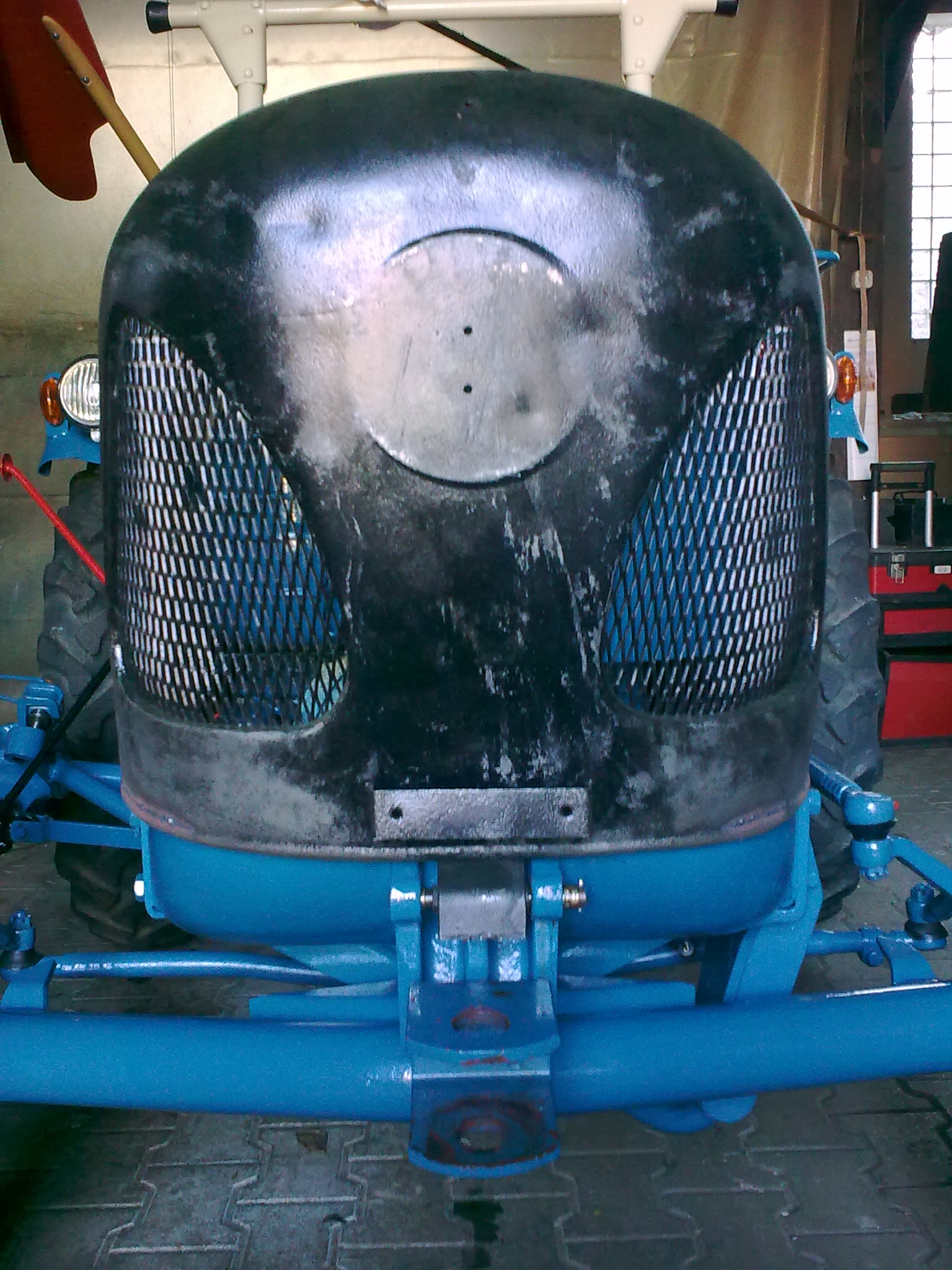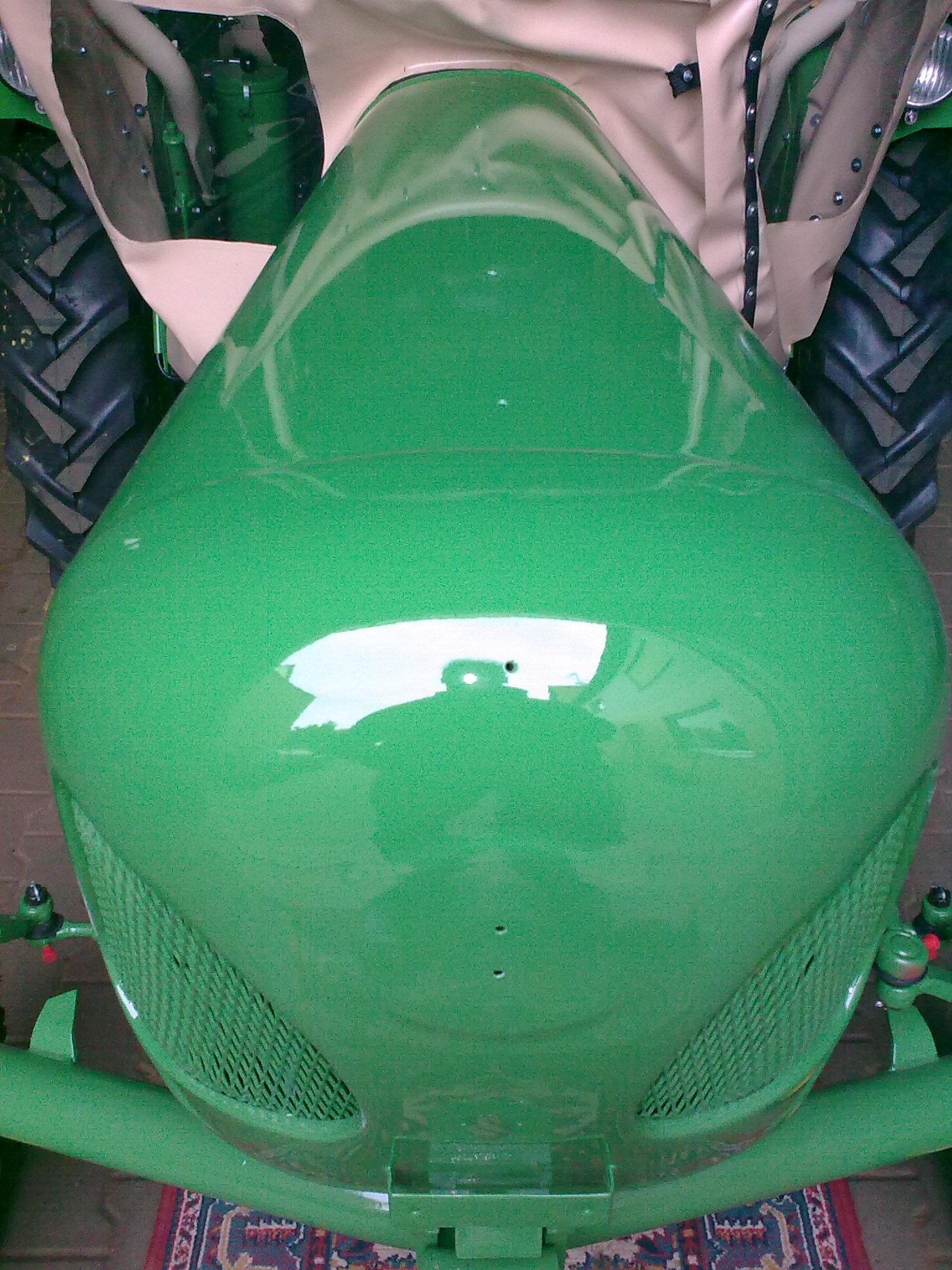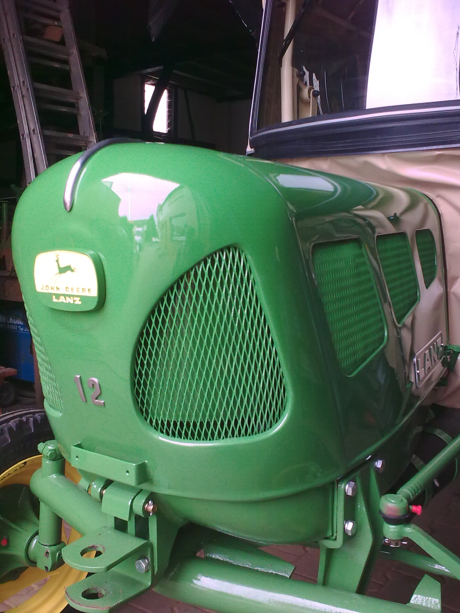 Heute haben wir die lackierte Motorhaube auf den Schlepper gesetzt. Morgen möchte ich den Zierrat anbringen.