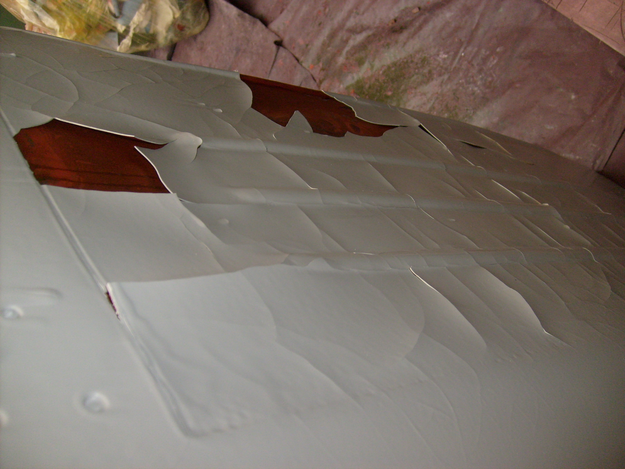 Auf der Außenseite wurde mit der Spraydose Acyrl- Grundierung aufgetragen. Leider hatten die keine rot-braune mehr, wer hat das bloß alles weggekauft(?) :roll: , habe also vom gleichen Hersteller die graue genommen. Deckt fürchterlich, aber es hat geklappt. Nach vier(!) tägiger Trocknung (sonst halbe Stunde plus Heißluftfön... :lol: )wurde Glasfaserspachtel aufgetragen wo es nötig war und der erste Grobschliff eingeleitet.