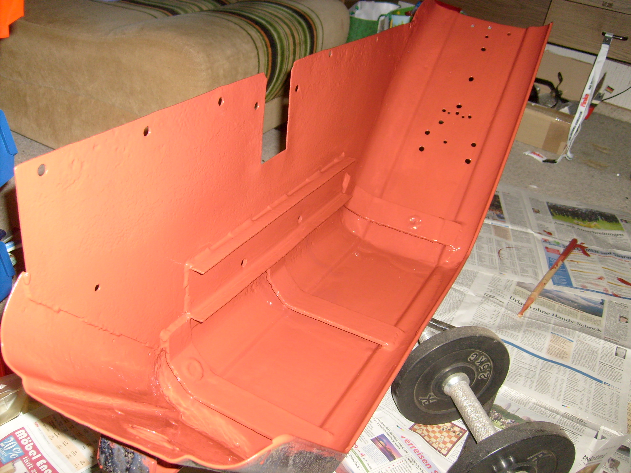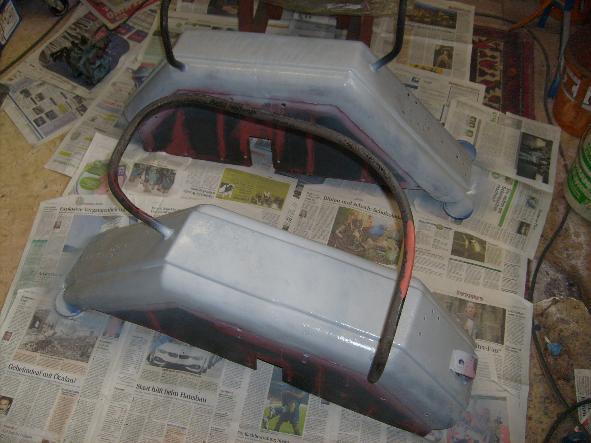 Nach soviel Frust mußte mal wieder etwas positives her: Die Hinterradkotflügel. Nach dem reinigen mit Wasser um das Fertan abzuspülen und der gewissenhaften(!) Durchtrocknung im Heizungskeller über Nacht wurde Grundierung zunächst mit dem abgewinkelten Pinsel unter die Verstrebungen aufgetragen, wo man mit der Lackierpistole keine ausreichende Schichtstärke hinbekommt.