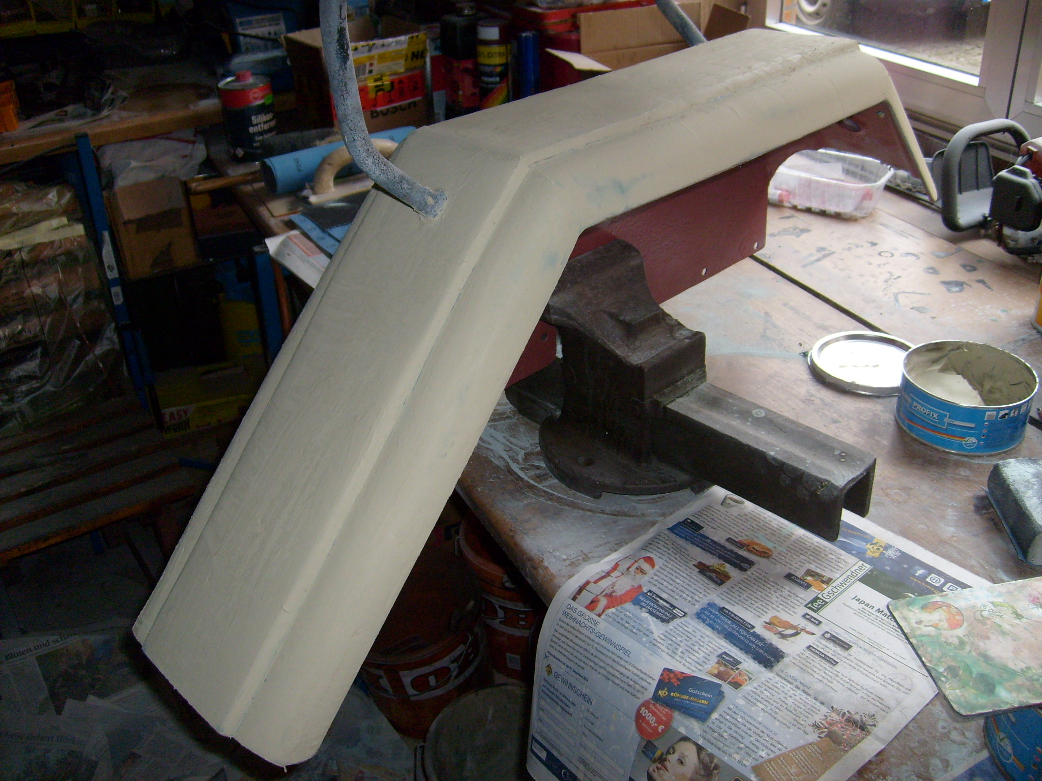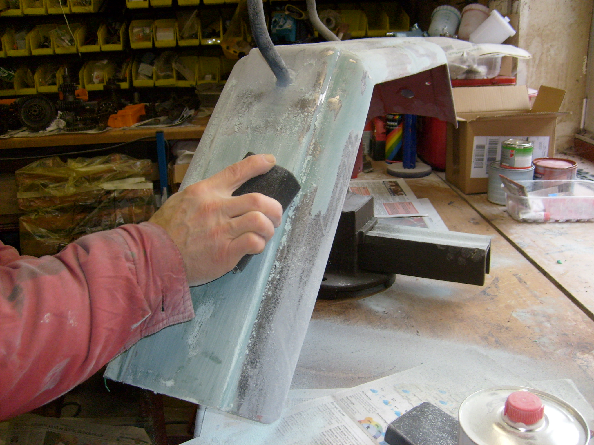 Jetzt ging es an den Kotflügeln weiter. Nach dem ersten Schliff des Glasfaserspachtel mit 40 er Papier kam eine Lage Füllspachtel drauf.