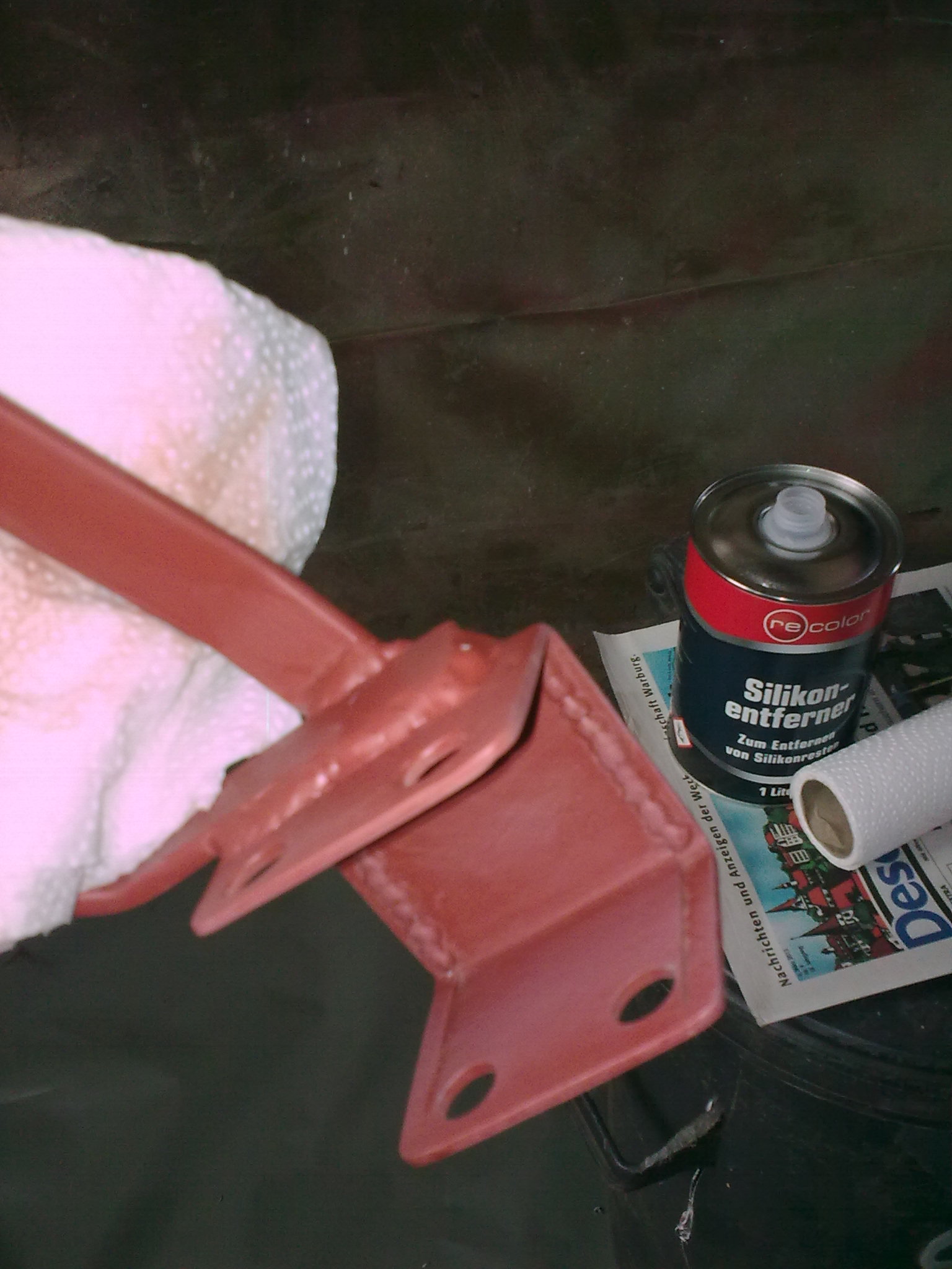 Letzter Arbeitsschritt nach dem Schleifen mit dem Pad ist immer reinigen mit Silikonentferner, der die Grundierung nicht mehr anlöst. Verdünnung oder andere Mittel ruinieren die Grundierung. Die Reinigung ist deshalb wichtig, weil so der Staub besser von den Teilen abgeführt wird und in meinem Fall hatte ich ja auch die Kleberückstände in das Pad geschmiert... :kloppe: Solches Schleifmaterial danach am besten sofort entsorgen, damit es nicht später zu Komplikationen kommt.