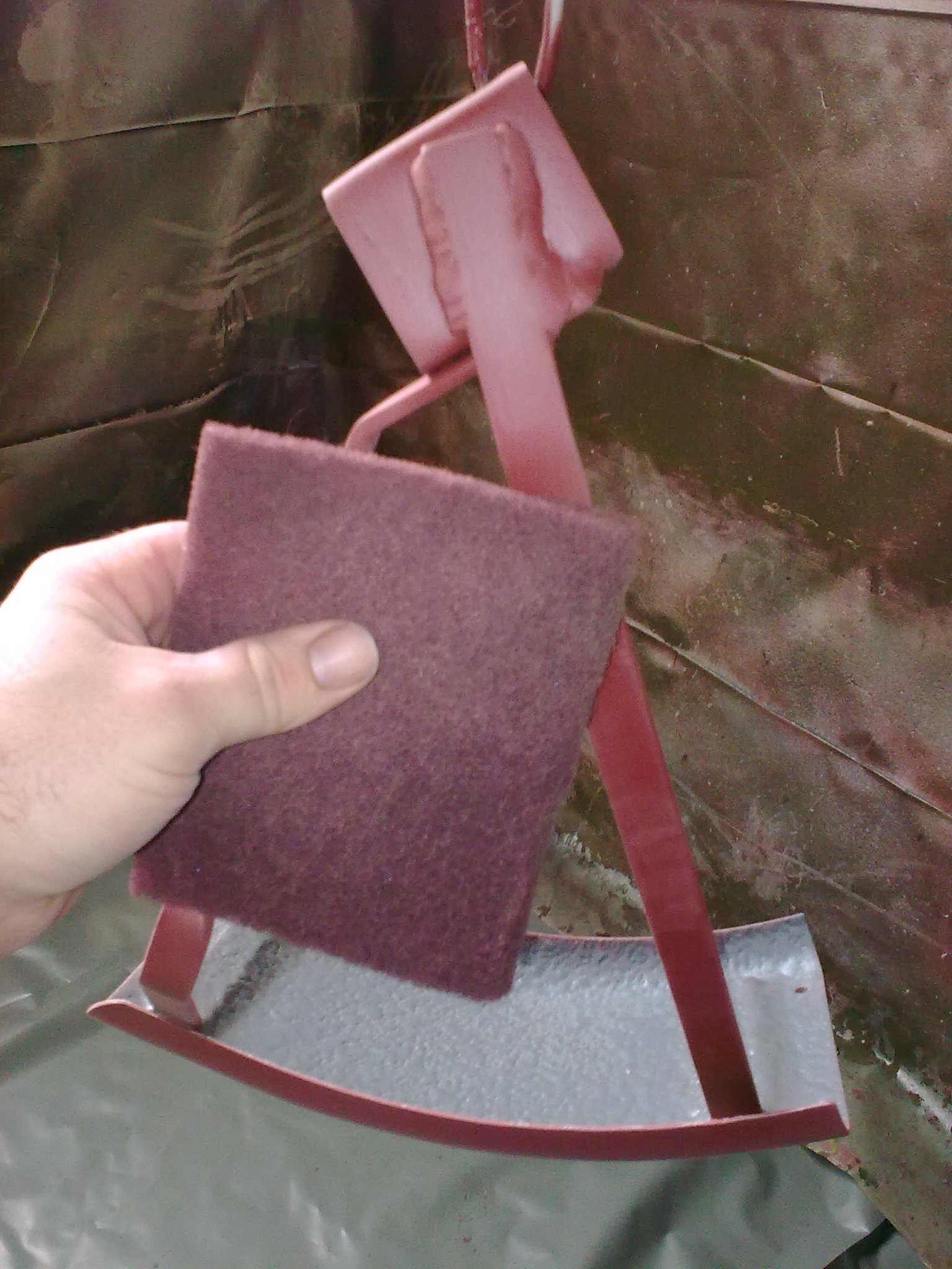 Nach halbstündigem ringen mit dem inneren Schweinehund habe ich mich jetzt dazu entschlossen, den Rand so zu belassen wie er ist. Zum Einen wird der Rand vom Sitzkissen komplett abgedeckt, zum Anderem ist die Wellaform nicht so arg, das man unbedingt Spachtel auftragen müßte. Ein weiterer Gesichtspunkt ist der, dass der komplette Sitz leicht verzogen ist (böser Baum?) und schöne Patina Rostporen aufweist, die ich ja auch nicht zuspachtel. Das Gesamtbild ist dann so auch ohne Sitzkissen passend, ohne das die eine Sache zugespachtelt und Popoglatt wirkt und gleich darunter der Rostfrass, ähm... die Patina anfängt.