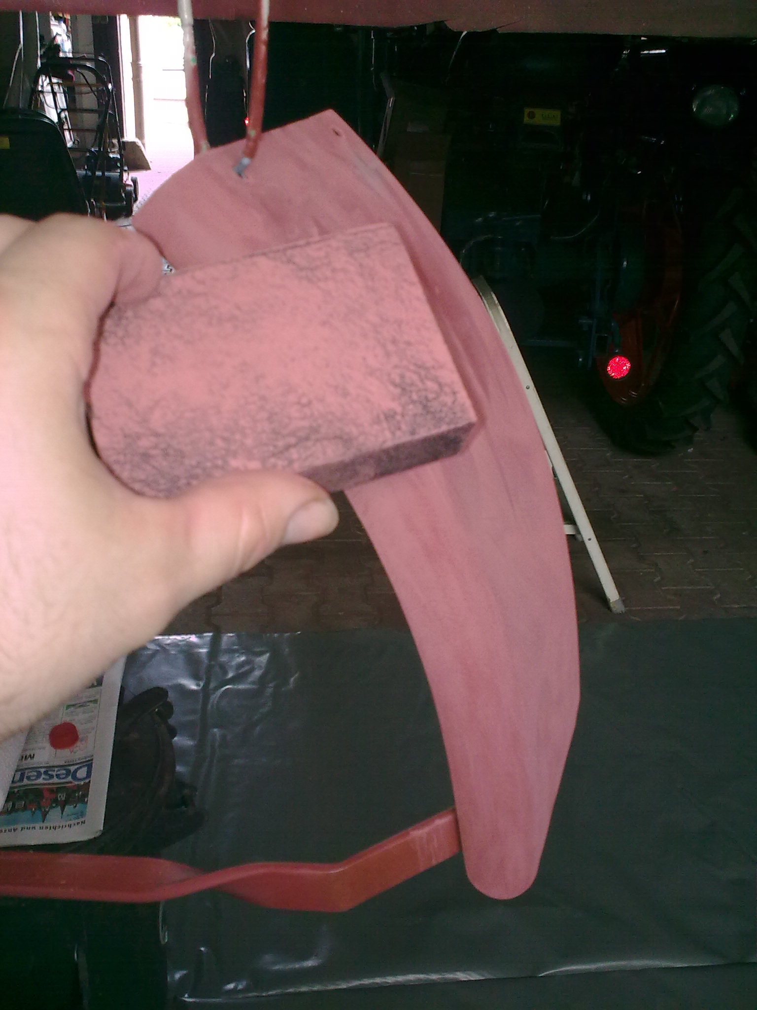 Dazu verwende ich einen im Baumarkt erhältlichen Schleifklotz, wo der Kern aus Schaumstoff beteht und beide Seiten unterschiedlich fein gekörnt sind. Zuerst wird die Träne mit der rauen Seite weggeschliffen. Danach schleift man mit der feinen Seite großflächig um den ersten Schliff herum. Ziel soll sein, dass rundherum gleich große Schleifränder entstehen und somit bei erneutem Grundieren eine flache Oberfläche ohne Randbildung entsteht. Wie beim anschleifen von Spachtelmasse. Liest sich leichter als es ist. Aber Übung macht den Meister und bei Lanz waren ab Werk mehr Rotznasen am Schlepper und es hat da auch schon keinen gestört. Also muss man es auch nicht unbedingt übertreiben. Nun war ich aber eh gerade dran, also habe ich die rausgeschliffen. Das kann man machen, muss aber nicht. Abschließend immer wieder mit dem roten Pad nachgehen.