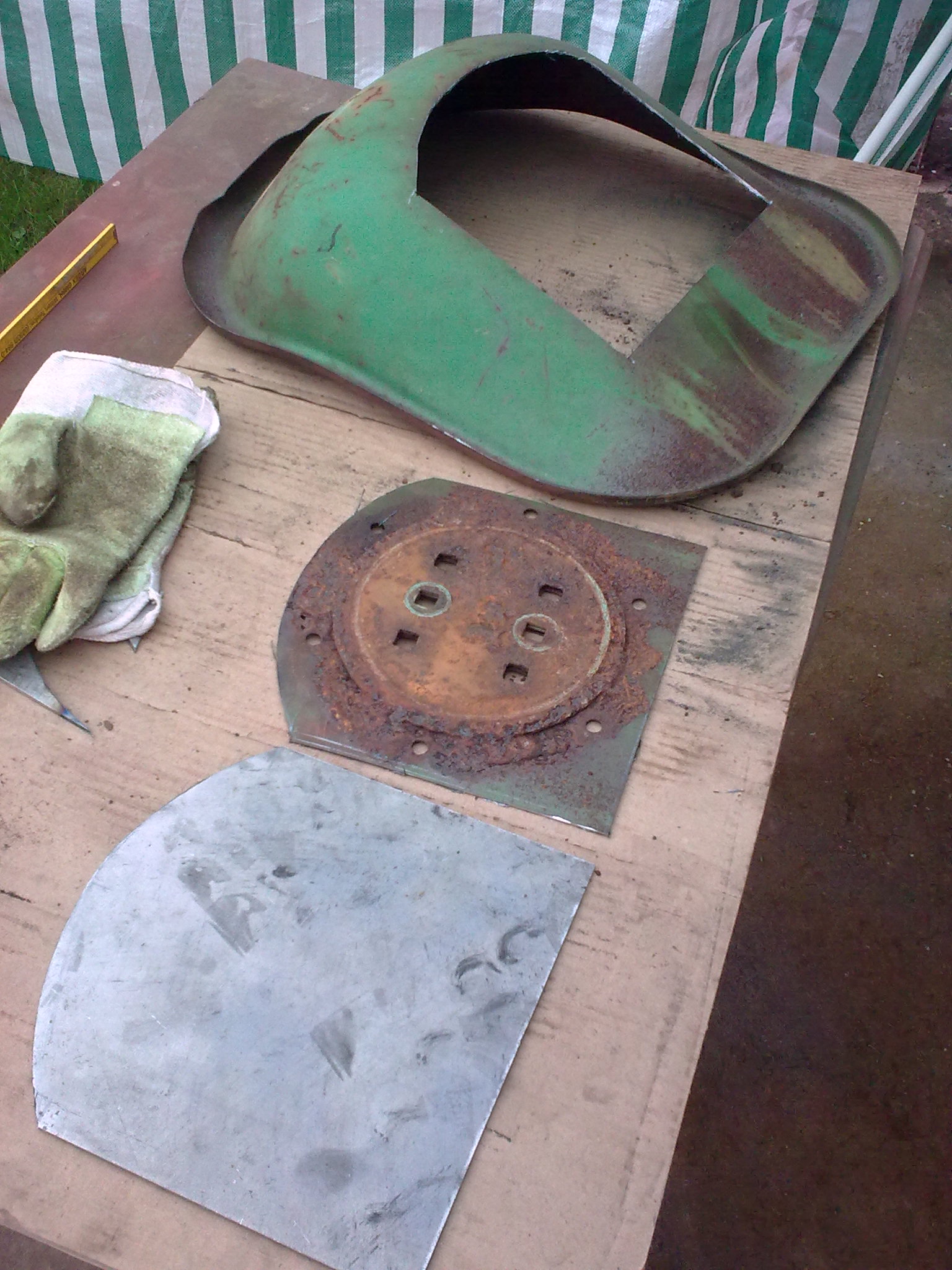 Im Bild aus dem Jahr 2012 sieht man vielleicht, wie der Rand nach hinten umgebogen war. Die Durchrostung ist schon rausgeflext und ein neues einzuschweißendes Teil angefertigt.