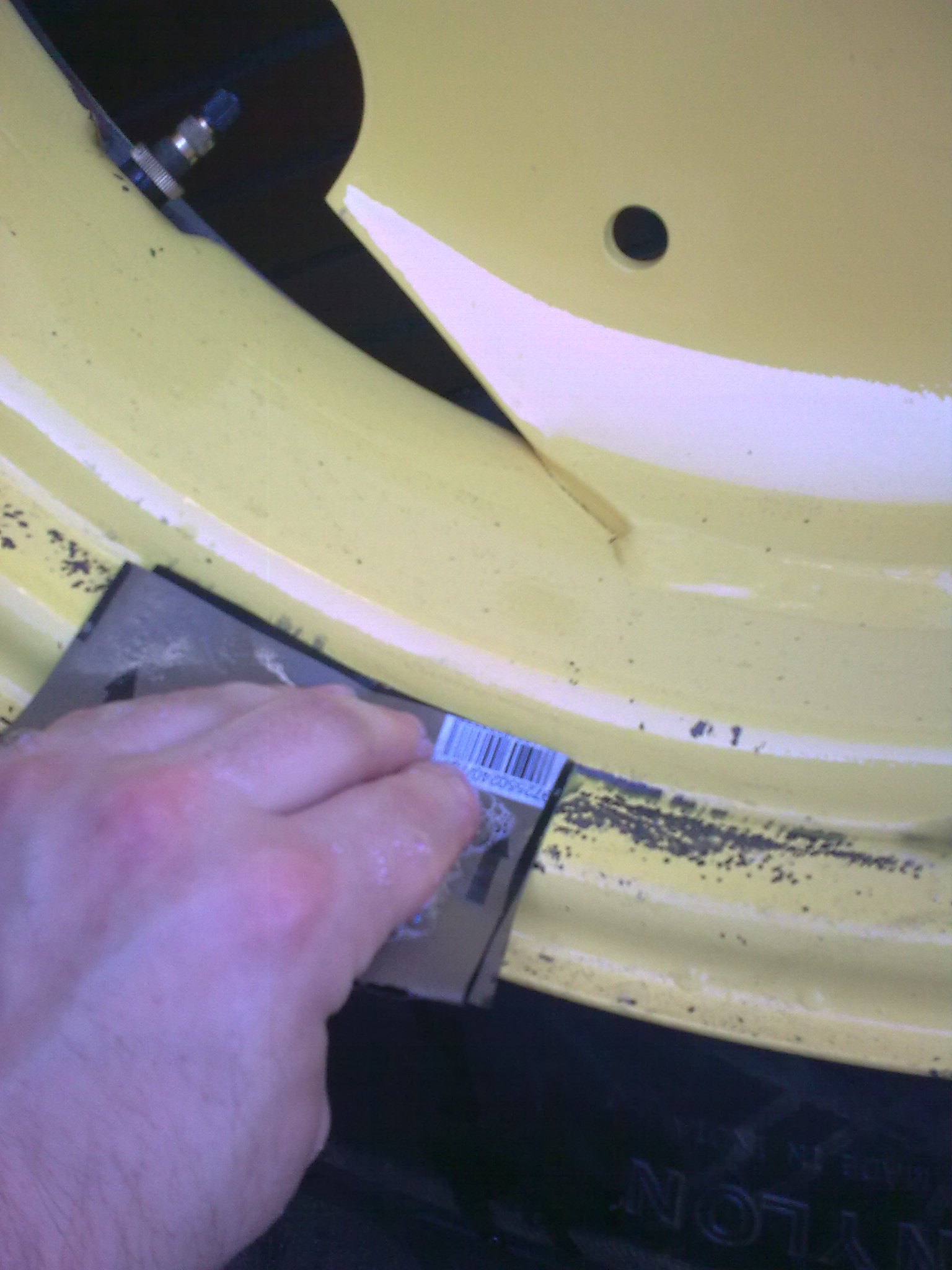 Die fertig lackierten Felgen habe ich zum Reifenaufzeiehen in ein Werkstatt gebracht, wo sie eine entsprechende Maschine dafür haben. Auf Nachfrage, ob dies den auch Kratzerfrei möglich sei sagten sie ganz klar, dass Sie es nicht 100 Prozent versprechen können, was ich natürlich auch verstehe. Ich würde mich da auch nicht festlegen wollen und nachher hat man Theater. Wobei ich denen das nicht Übel genommen hätte. So habe ich mich zu einem folgenschweren Vorgehen entschieden. An einem wunderschönen Sonntag Morgen habe ich die Felgen am Rand komplett mit 200 Meter Isolierband abgeklebt, um den Lack bei möglichen Ausrutschern beim montieren zu schützen. Das hat auch wunderbar funktioniert. Bis zum abziehen des Isobandes...