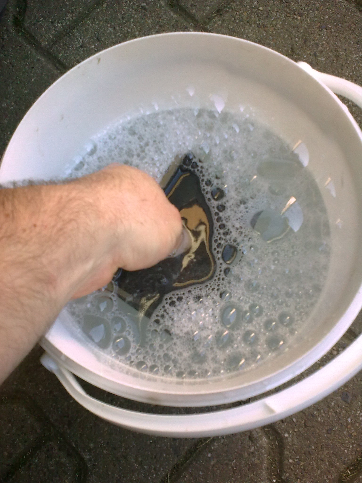 Papier immer wieder in das Wasser eintauchen, um den Schleifschlamm zu entfernen. Die Schleifpapierfläche häufig wechseln, weil man sich sonst unnötig quält und auf einer Stelle herumschleift, ohne das es voran geht, also der Farbabtrag zu gering ist. Das Wasser sollte warm sein. Auch dies erleichtert die Schleifarbeit.