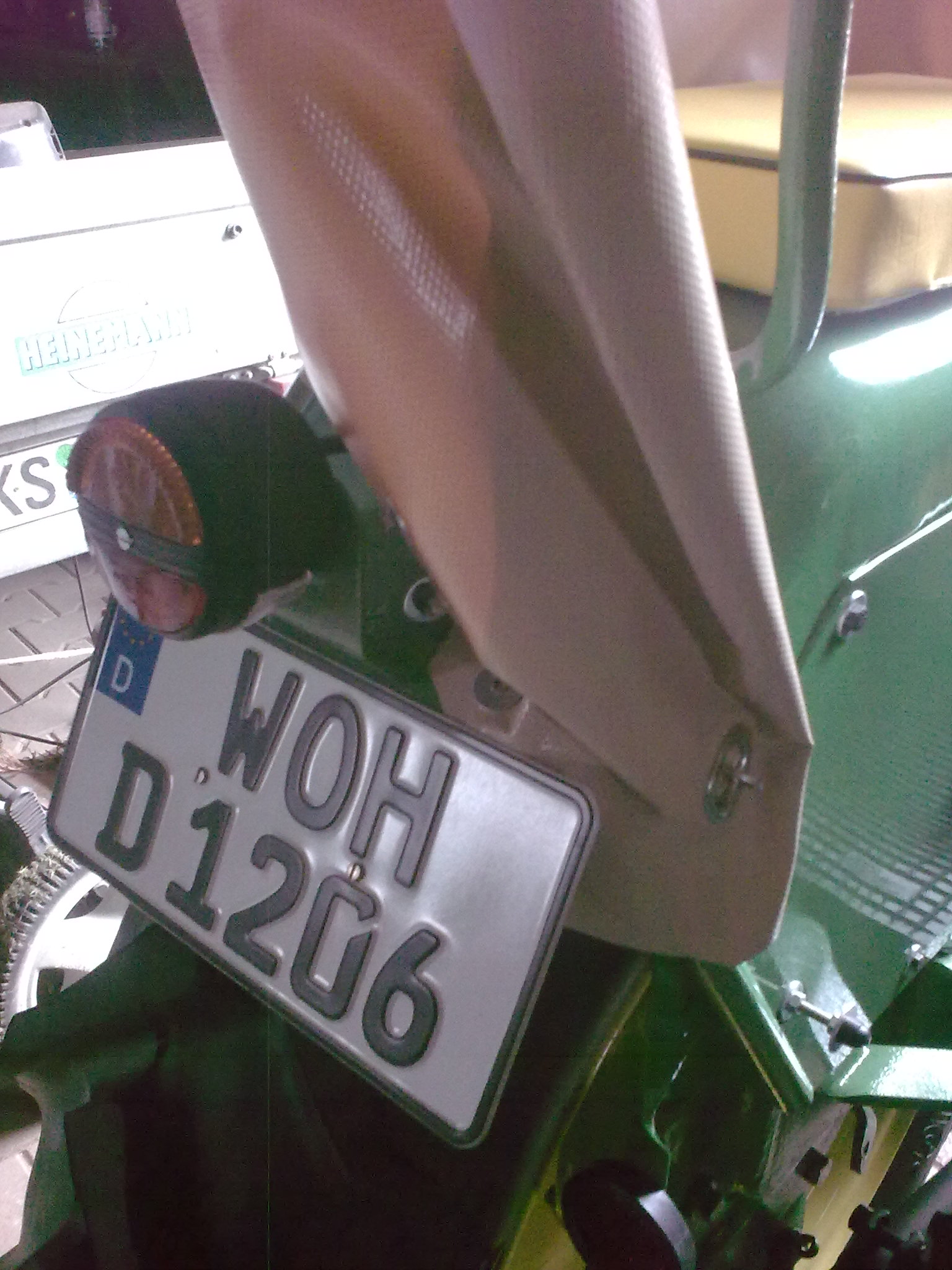 Dabei fiel mir auf, dass die Befestigung der Seitenplanen vom Fritzmeierverdeck ohne eingehangene Heckplane noch Verbesserungswürdig ist, um die Rücklichter und natürlich das Kennzeichen besser erkennen zu können. Das habe ich dann heute Morgen erledigt. Ich mußte nur jeweils eine weitere Öse in die Seitenplanen machen und diese an den an den Hinterradkotflügeln befestigten Drehwirbel befestigen, die eigentlich die heruntergelassene Rückenplane halten.