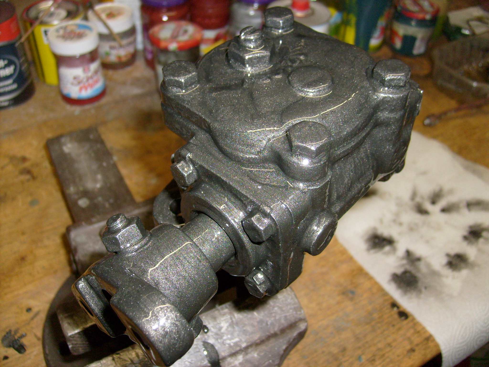 ..und dann auch schön mit Hammerit lackiert. Ebenso wie das Lenkgetriebe, wo bei der Montage bzw. eventueller späterer Reparatur noch die ein oder andere Blessur entstehen kann. Mit Hammerit kan man das optisch gut immer wieder retuschieren....außerdem war die Grundfarbe bei beiden Teilen schwarz..von daher... 8)