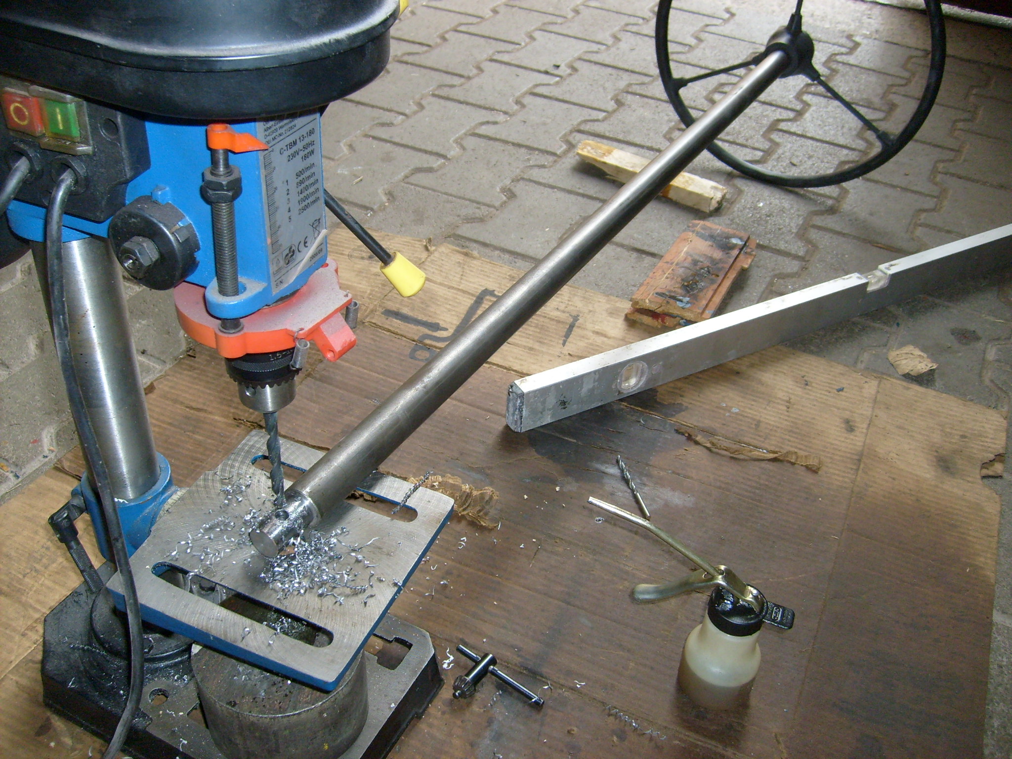 und dann den Flansch in dieser Position mit der Handbohrmaschine und 8 er Bohrer angebohrt. Eigentlich wollte ich das ja genau so anbohren wie es im original Lenkrohr ist, aber die haben da im Werk scheinbar nicht darauf geachtet wie die Speichen stehen bei Geradeausfahrt. Die drei Speichen standen alle auf "kein Bier vor halb vier" irgendwas, aber nichts genaues. Das geht besser. Zurück zu Restaurationsberichte
