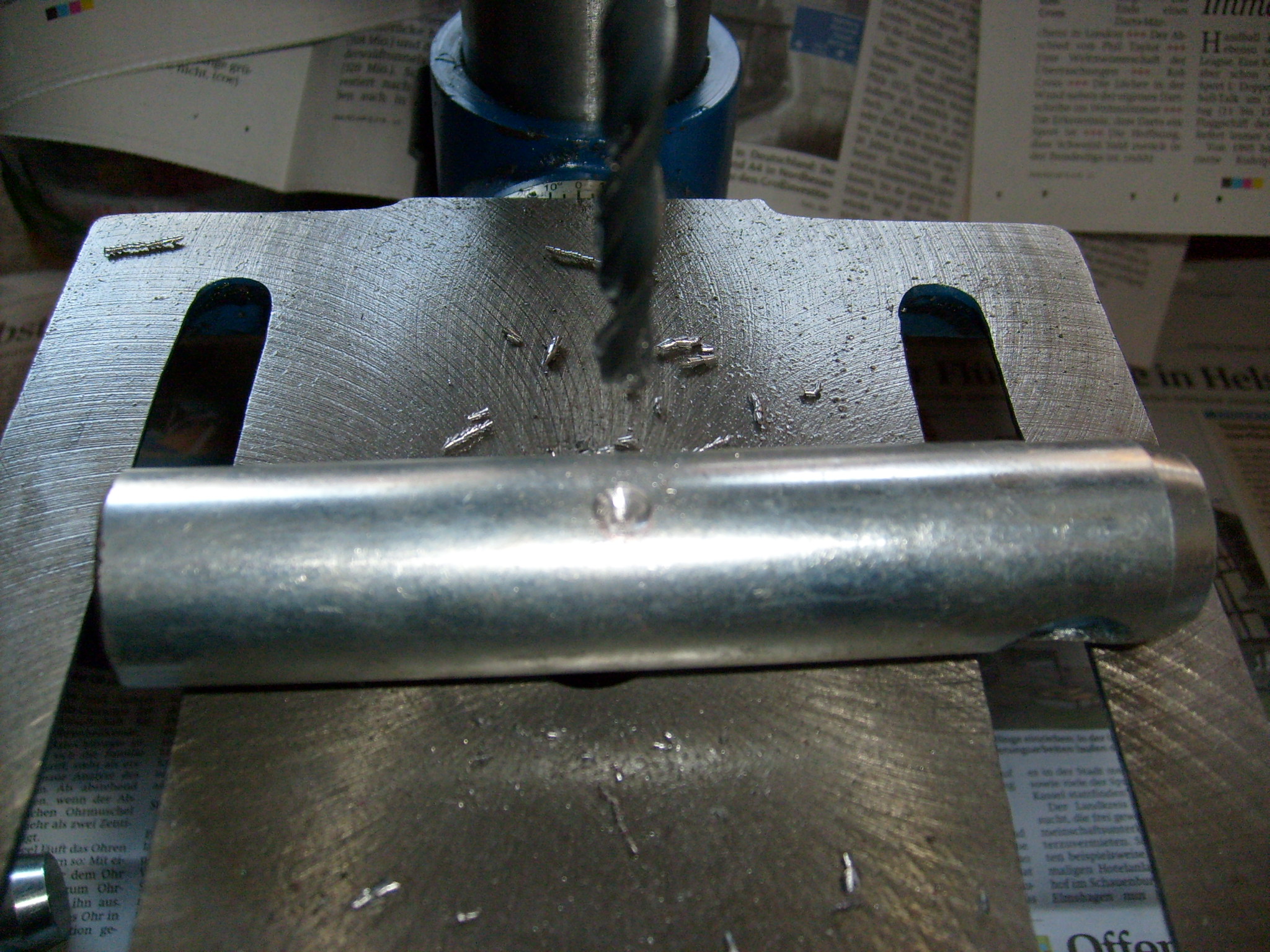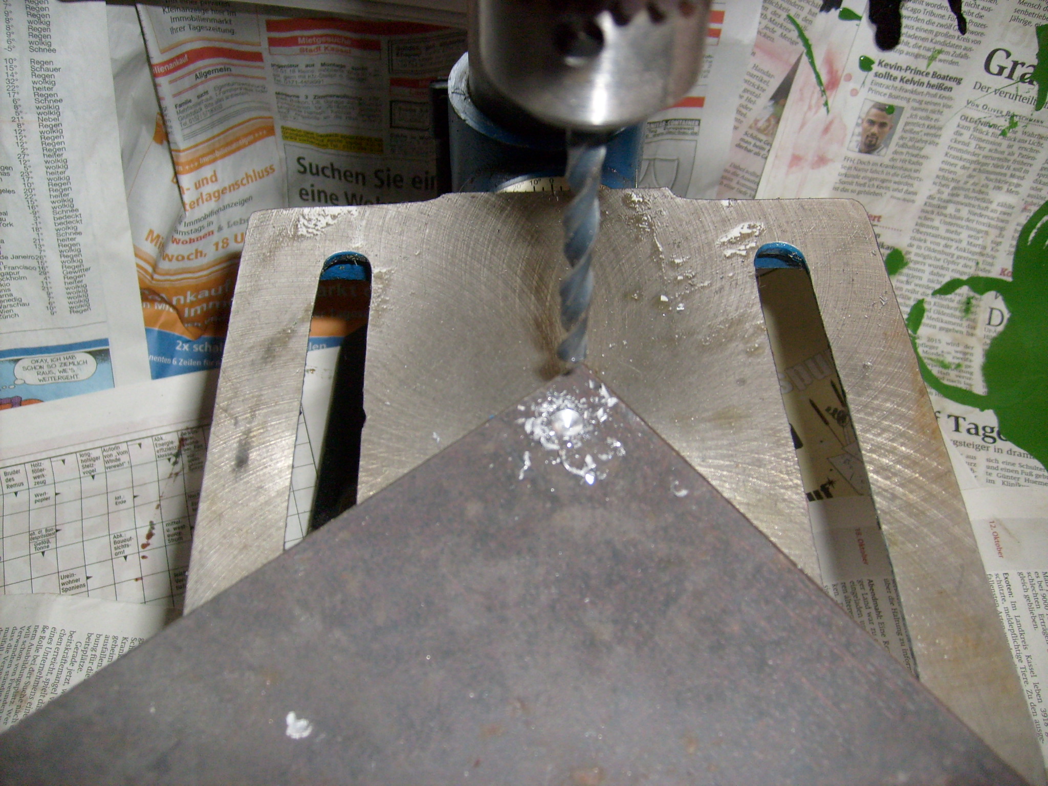 ...Abstände der Bohrungen angezeichnet, gekörnt und gebohrt. Oben jeweils 12,5 mm für die M12 er Schrauben. Landwirtschaft braucht Luft! :wink: Dabei hat sich stufenweises bohren bewährt, angefangen mit 6mm, 8mm usw... . Nur die untere Bohrung, die musste auf 14 mm gebohrt werden für den Bolzen, der da durch geschoben gehört. Jetzt hatte ich keine Lust extra deswegen zum Metallbauer zu fahren. Daher selber an der Bohrung rumgeorgelt... :oops: . Gut das der Bohrer fast stumpf war, sonst hätte das gar nicht funktioniert. War mehr ein fräsen als bohren. :lol: Egal....